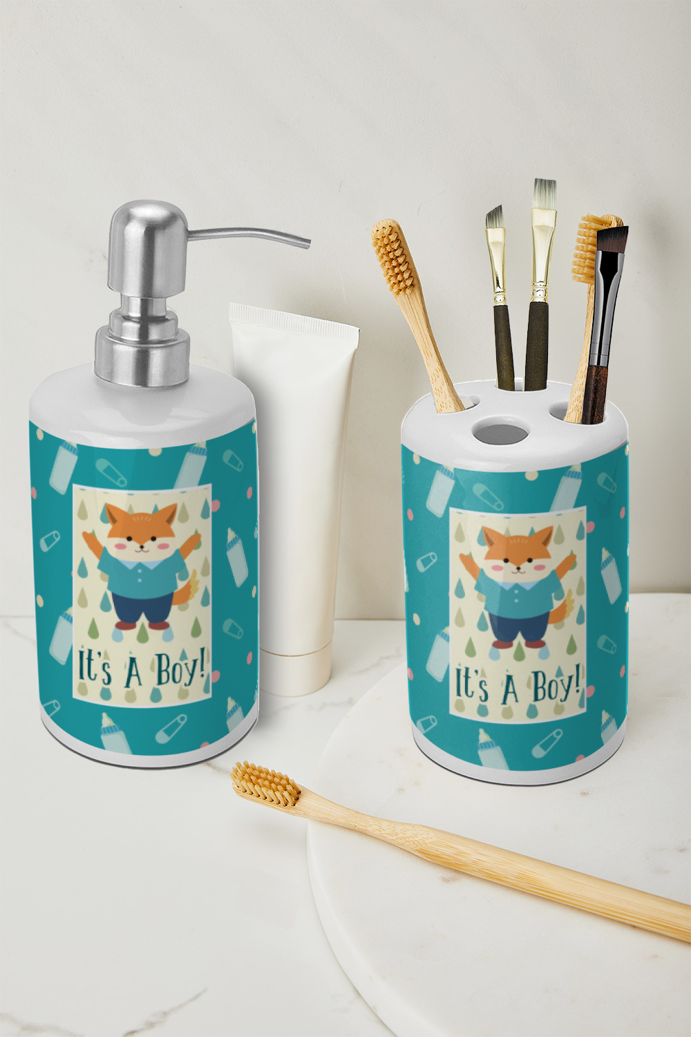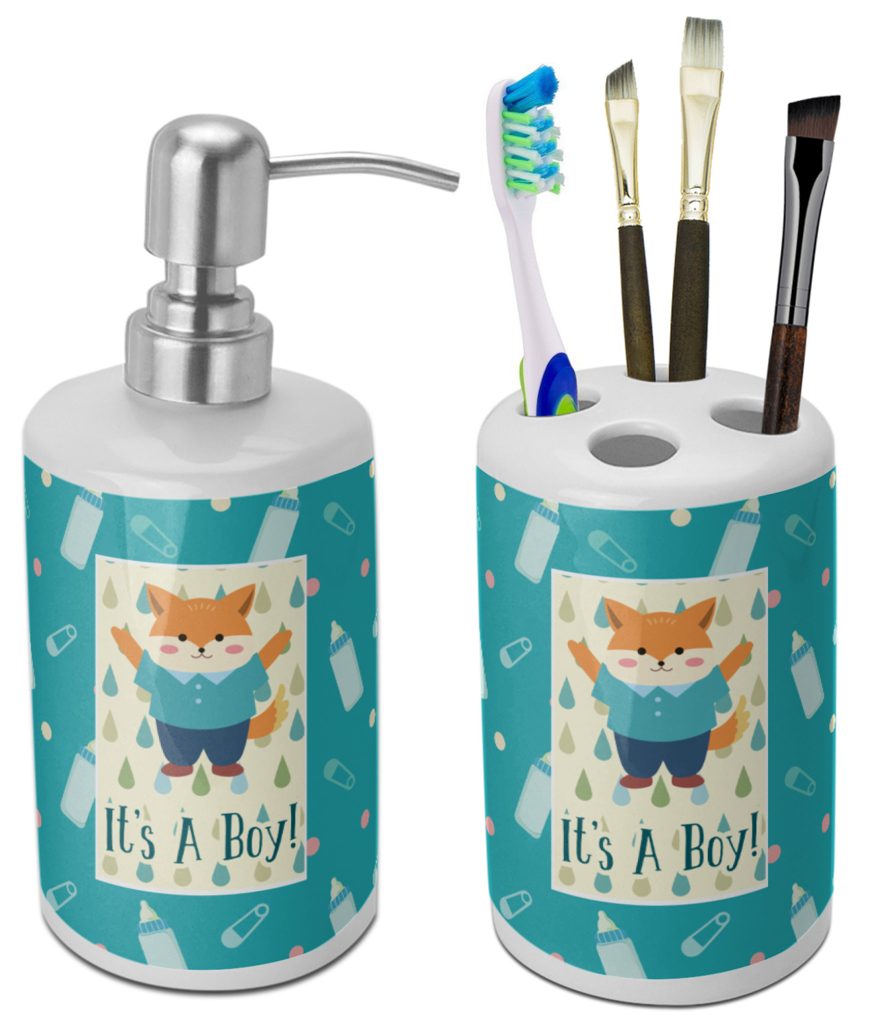 This design is for a new baby boy. The background is a bright teal color with baby bottles and safety pins. The secondary background has blue, teal, and green raindrops with a soft yellow behind them. The teal background almost acts as a frame around the yellow background. On the yellow background there is a fun little fox graphic celebrating with the words underneath him: "It's A Boy!"
