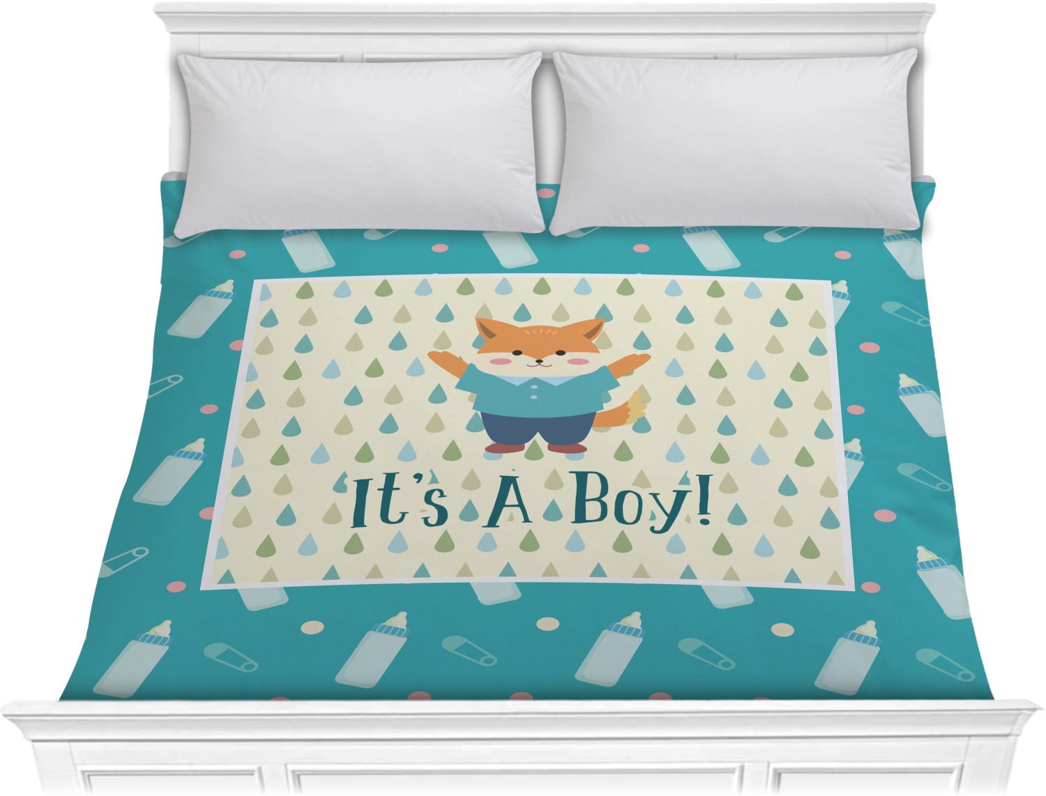 This design is for a new baby boy. The background is a bright teal color with baby bottles and safety pins. The secondary background has blue, teal, and green raindrops with a soft yellow behind them. The teal background almost acts as a frame around the yellow background. On the yellow background there is a fun little fox graphic celebrating with the words underneath him: "It's A Boy!"