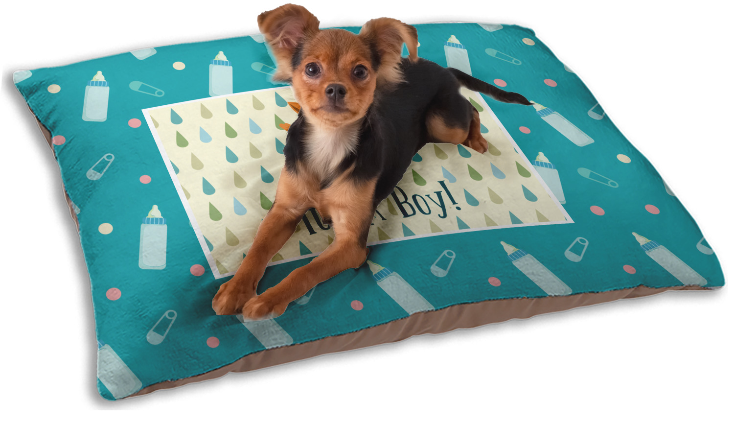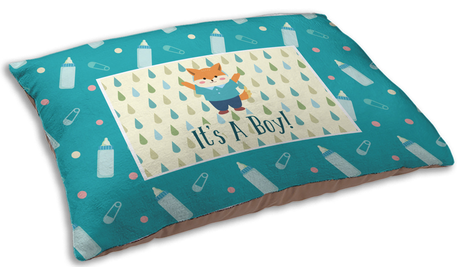 This design is for a new baby boy. The background is a bright teal color with baby bottles and safety pins. The secondary background has blue, teal, and green raindrops with a soft yellow behind them. The teal background almost acts as a frame around the yellow background. On the yellow background there is a fun little fox graphic celebrating with the words underneath him: "It's A Boy!"