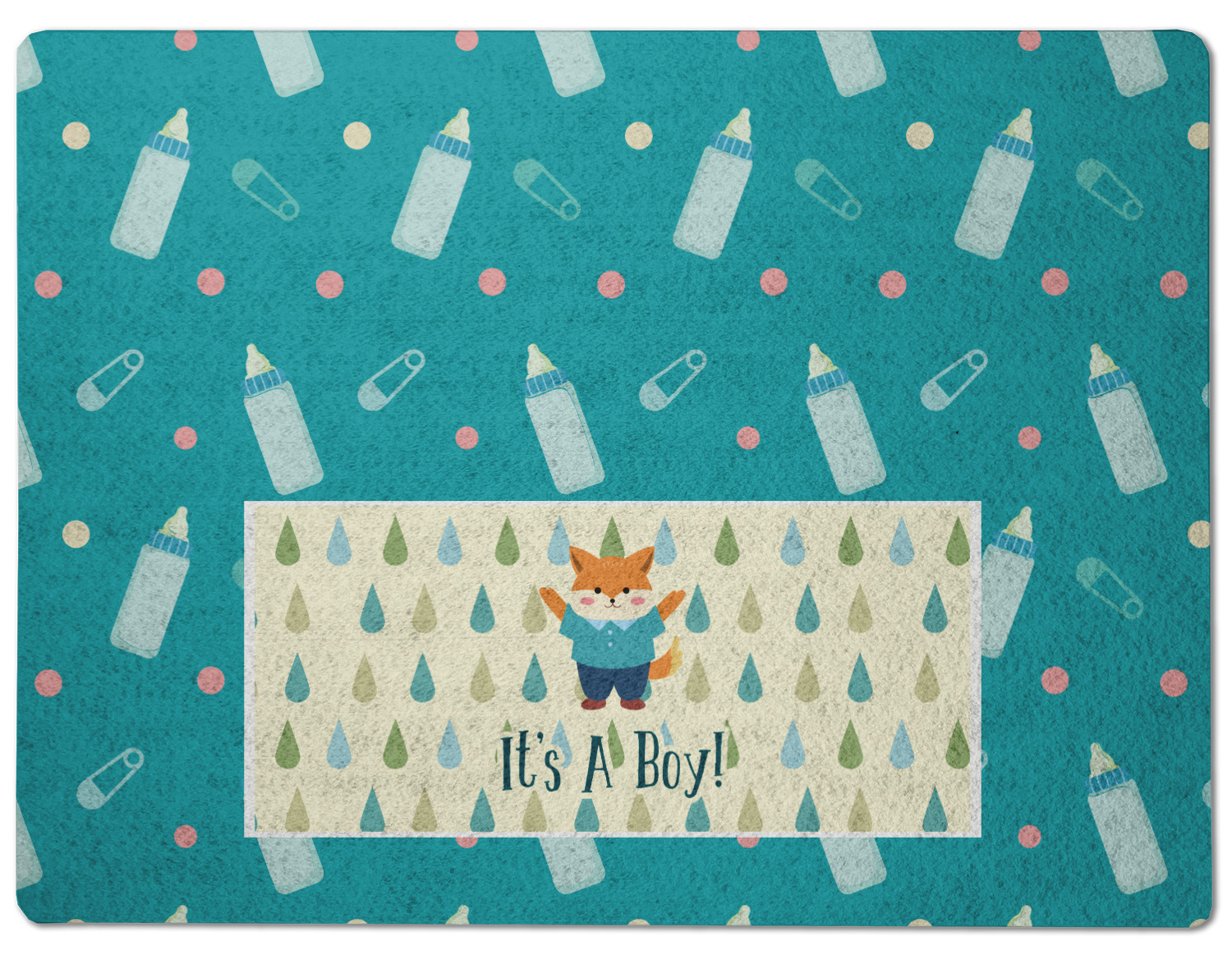This design is for a new baby boy. The background is a bright teal color with baby bottles and safety pins. The secondary background has blue, teal, and green raindrops with a soft yellow behind them. The teal background almost acts as a frame around the yellow background. On the yellow background there is a fun little fox graphic celebrating with the words underneath him: "It's A Boy!"