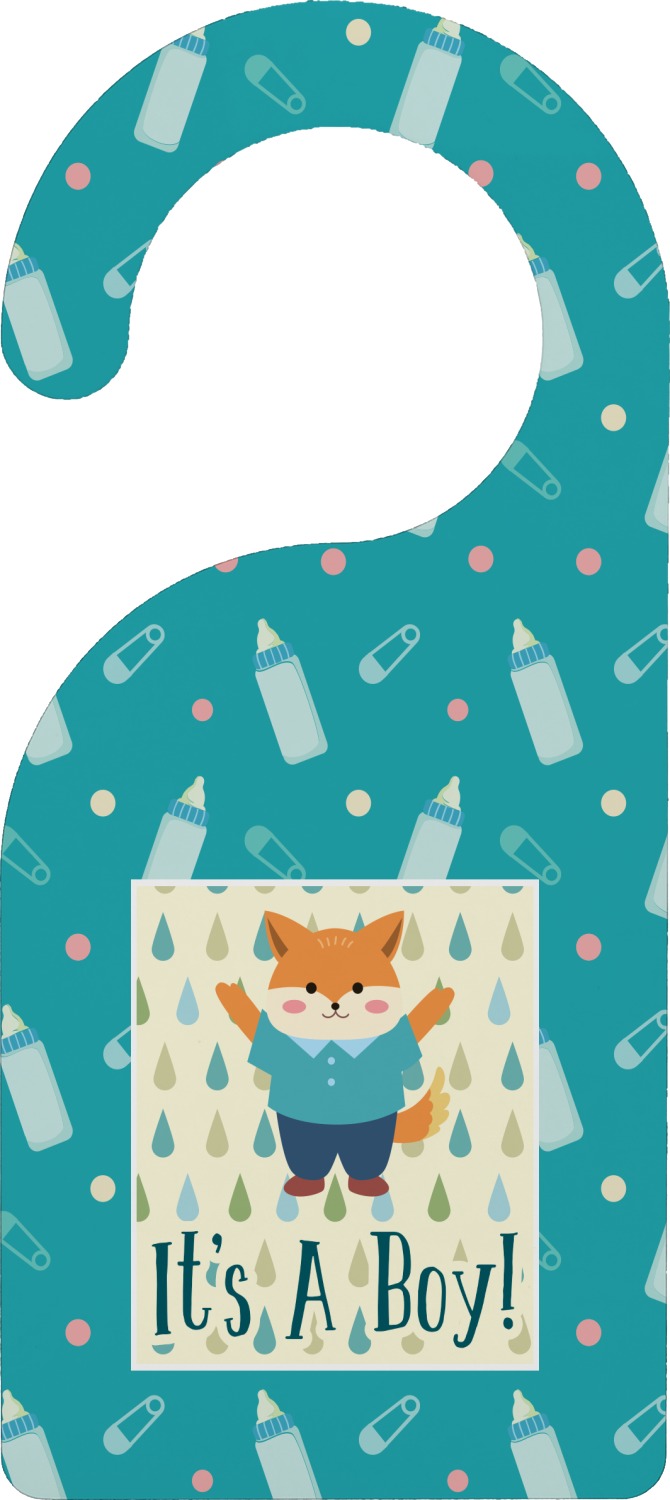 This design is for a new baby boy. The background is a bright teal color with baby bottles and safety pins. The secondary background has blue, teal, and green raindrops with a soft yellow behind them. The teal background almost acts as a frame around the yellow background. On the yellow background there is a fun little fox graphic celebrating with the words underneath him: "It's A Boy!"