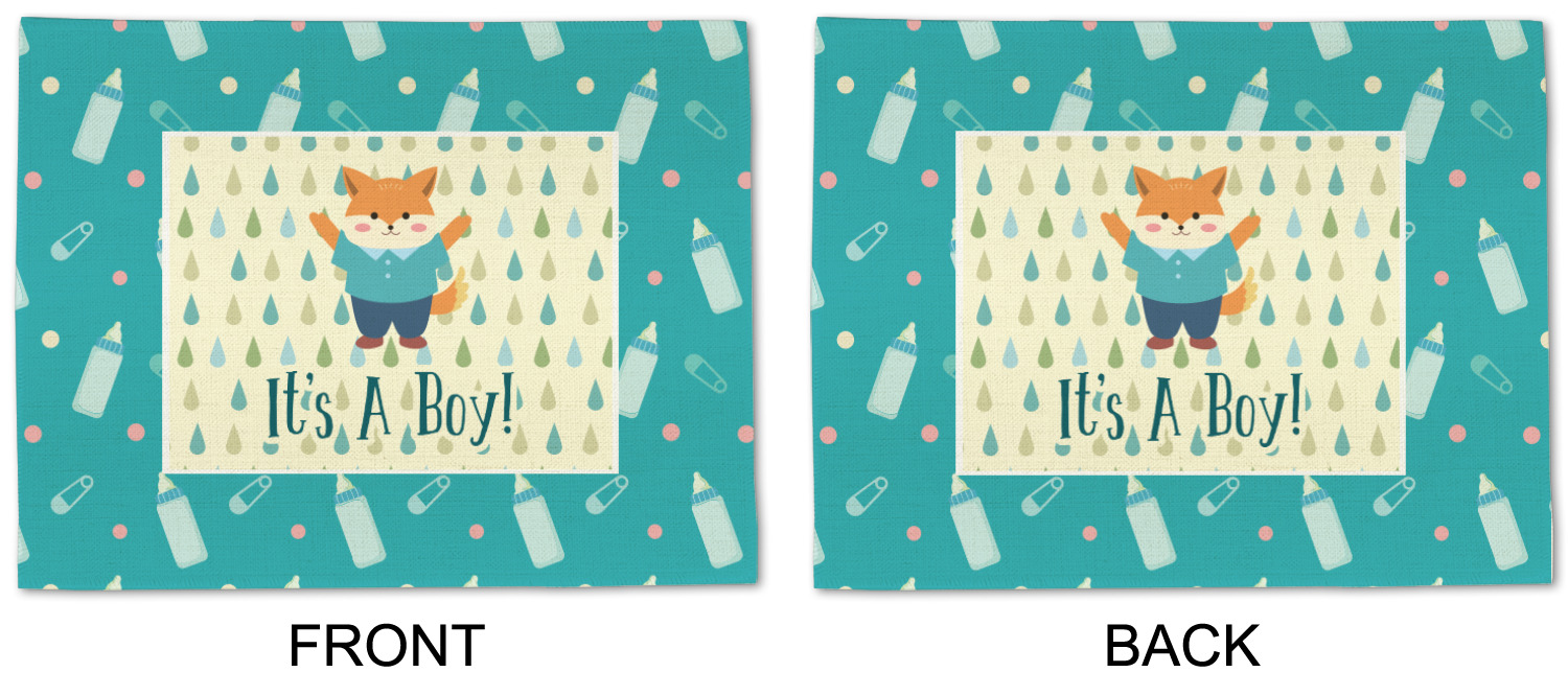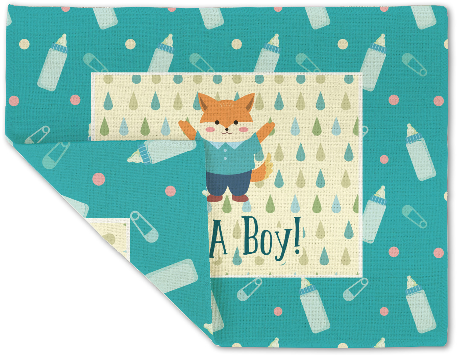 This design is for a new baby boy. The background is a bright teal color with baby bottles and safety pins. The secondary background has blue, teal, and green raindrops with a soft yellow behind them. The teal background almost acts as a frame around the yellow background. On the yellow background there is a fun little fox graphic celebrating with the words underneath him: "It's A Boy!"
