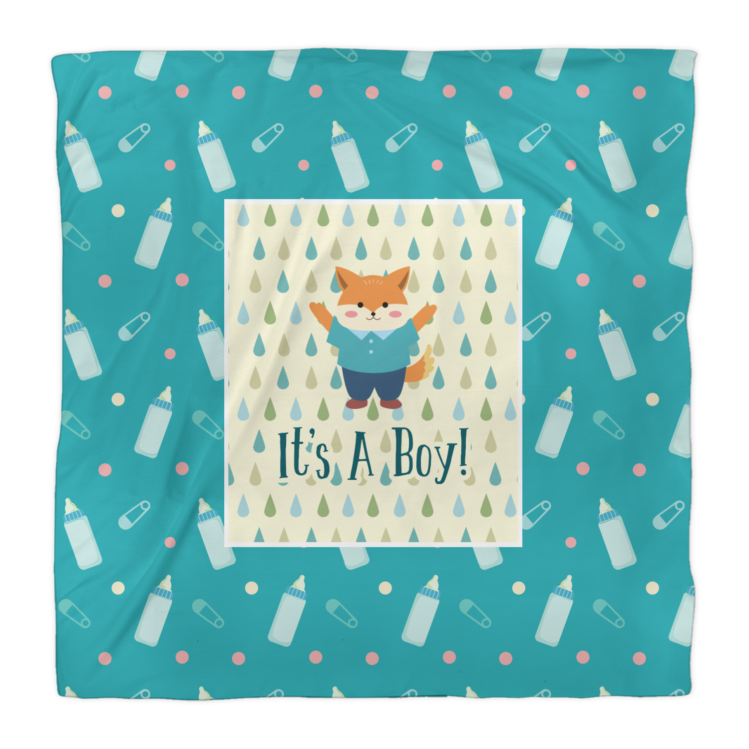 This design is for a new baby boy. The background is a bright teal color with baby bottles and safety pins. The secondary background has blue, teal, and green raindrops with a soft yellow behind them. The teal background almost acts as a frame around the yellow background. On the yellow background there is a fun little fox graphic celebrating with the words underneath him: "It's A Boy!"