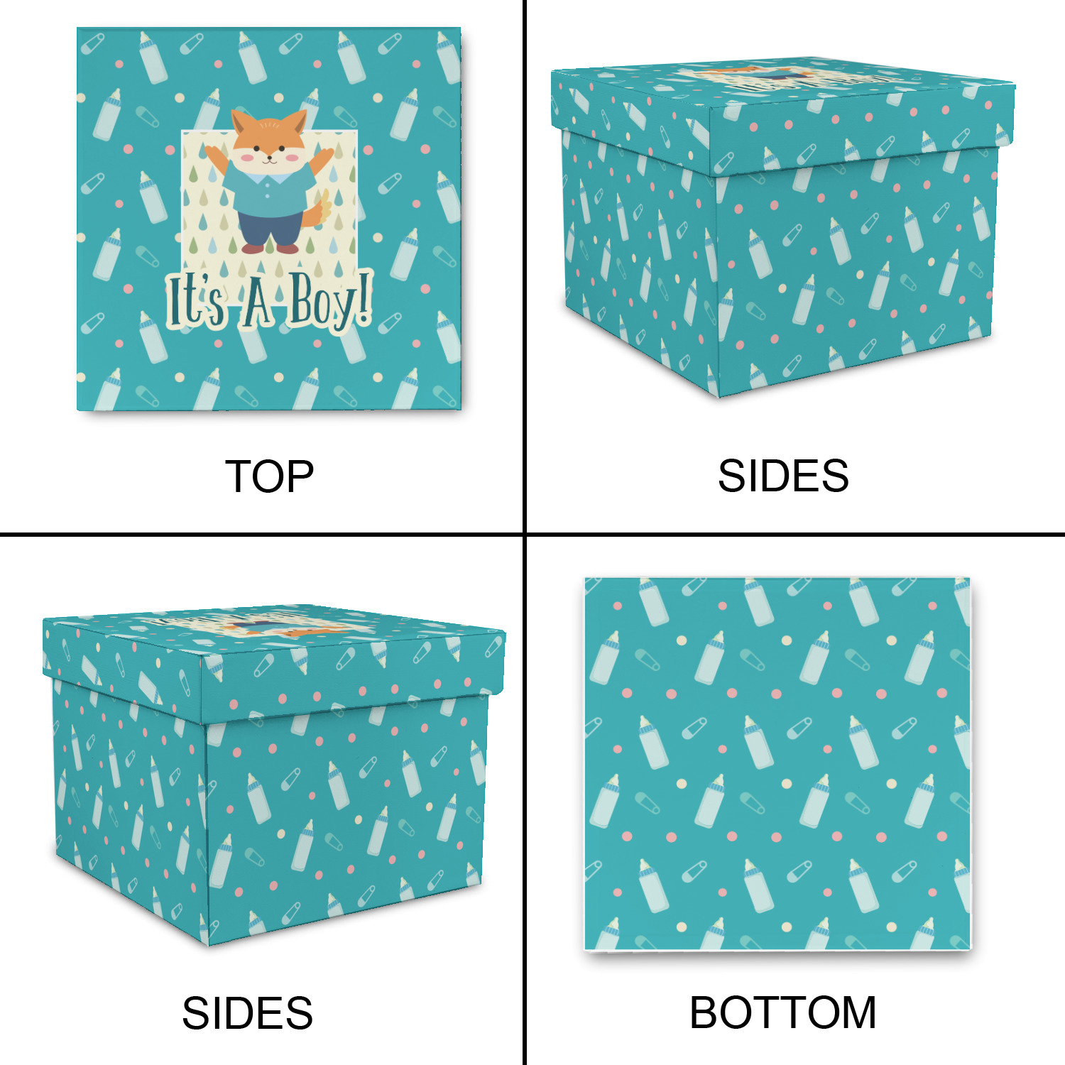 This design is for a new baby boy. The background is a bright teal color with baby bottles and safety pins. The secondary background has blue, teal, and green raindrops with a soft yellow behind them. The teal background almost acts as a frame around the yellow background. On the yellow background there is a fun little fox graphic celebrating with the words underneath him: "It's A Boy!"