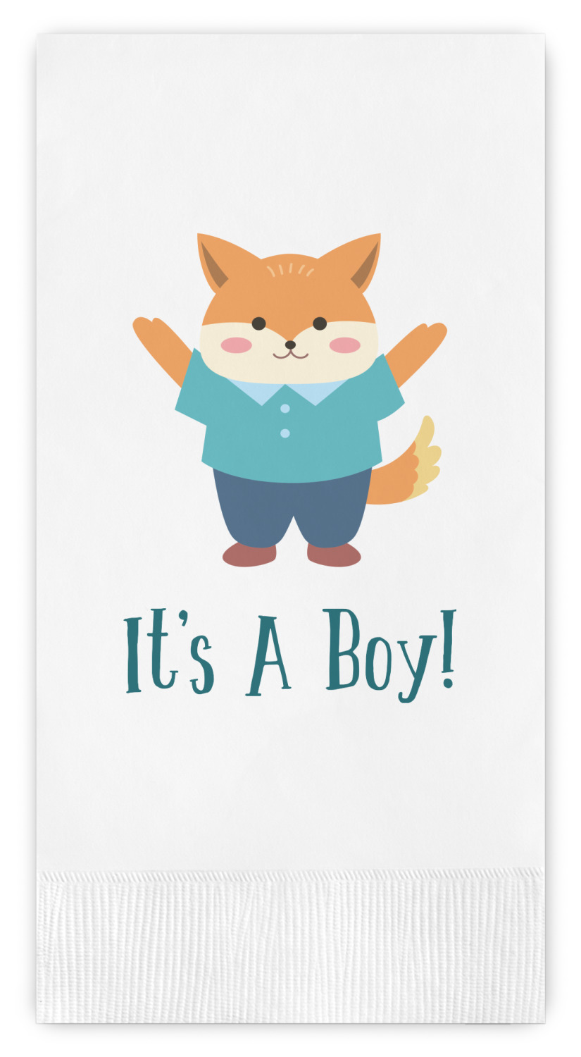 This design is for a new baby boy. The background is a bright teal color with baby bottles and safety pins. The secondary background has blue, teal, and green raindrops with a soft yellow behind them. The teal background almost acts as a frame around the yellow background. On the yellow background there is a fun little fox graphic celebrating with the words underneath him: "It's A Boy!"