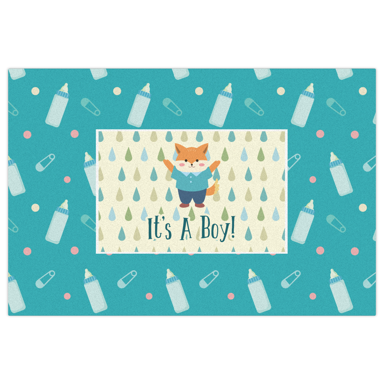 This design is for a new baby boy. The background is a bright teal color with baby bottles and safety pins. The secondary background has blue, teal, and green raindrops with a soft yellow behind them. The teal background almost acts as a frame around the yellow background. On the yellow background there is a fun little fox graphic celebrating with the words underneath him: "It's A Boy!"