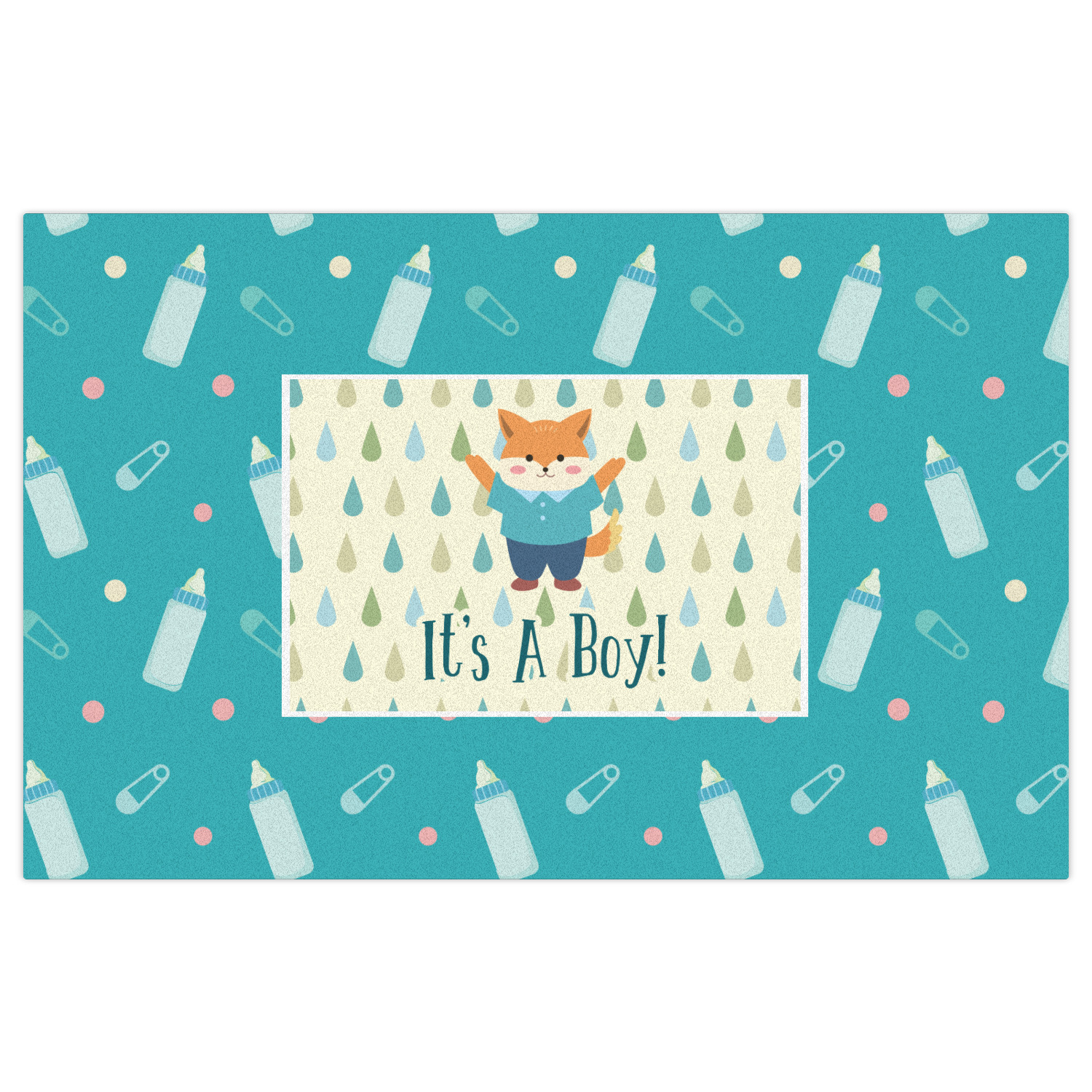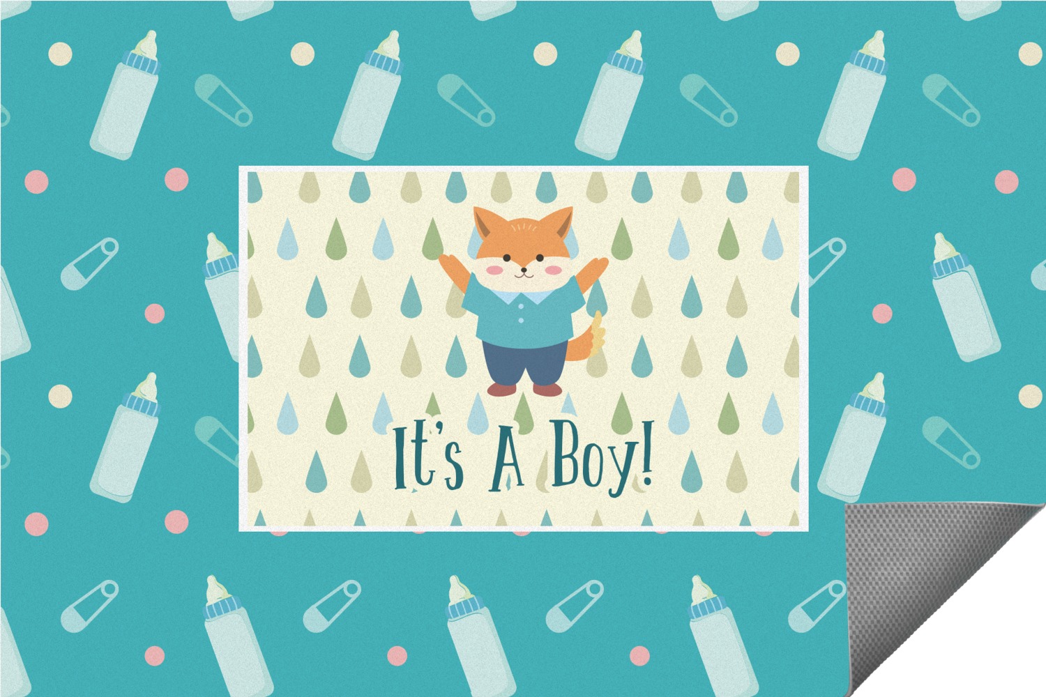 This design is for a new baby boy. The background is a bright teal color with baby bottles and safety pins. The secondary background has blue, teal, and green raindrops with a soft yellow behind them. The teal background almost acts as a frame around the yellow background. On the yellow background there is a fun little fox graphic celebrating with the words underneath him: "It's A Boy!"