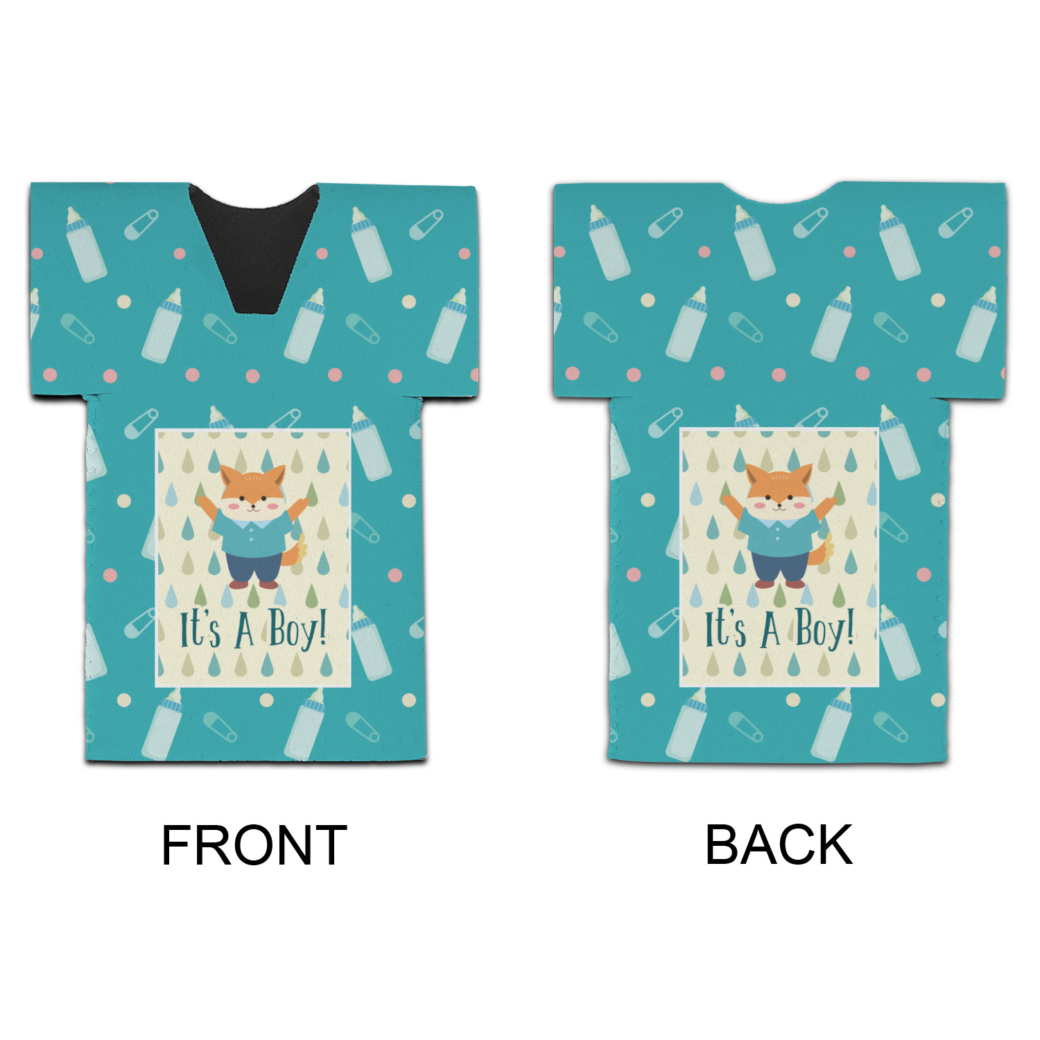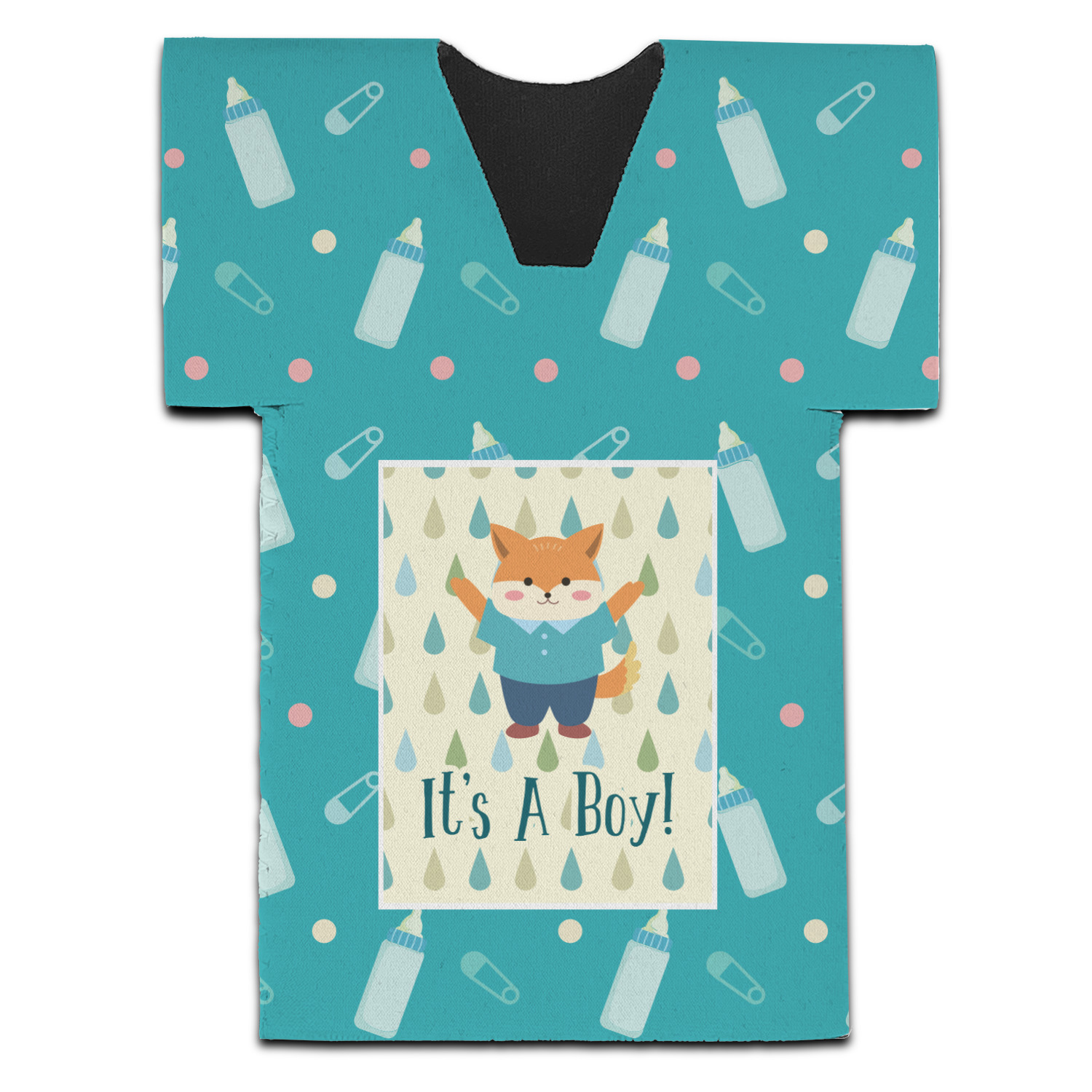 This design is for a new baby boy. The background is a bright teal color with baby bottles and safety pins. The secondary background has blue, teal, and green raindrops with a soft yellow behind them. The teal background almost acts as a frame around the yellow background. On the yellow background there is a fun little fox graphic celebrating with the words underneath him: "It's A Boy!"