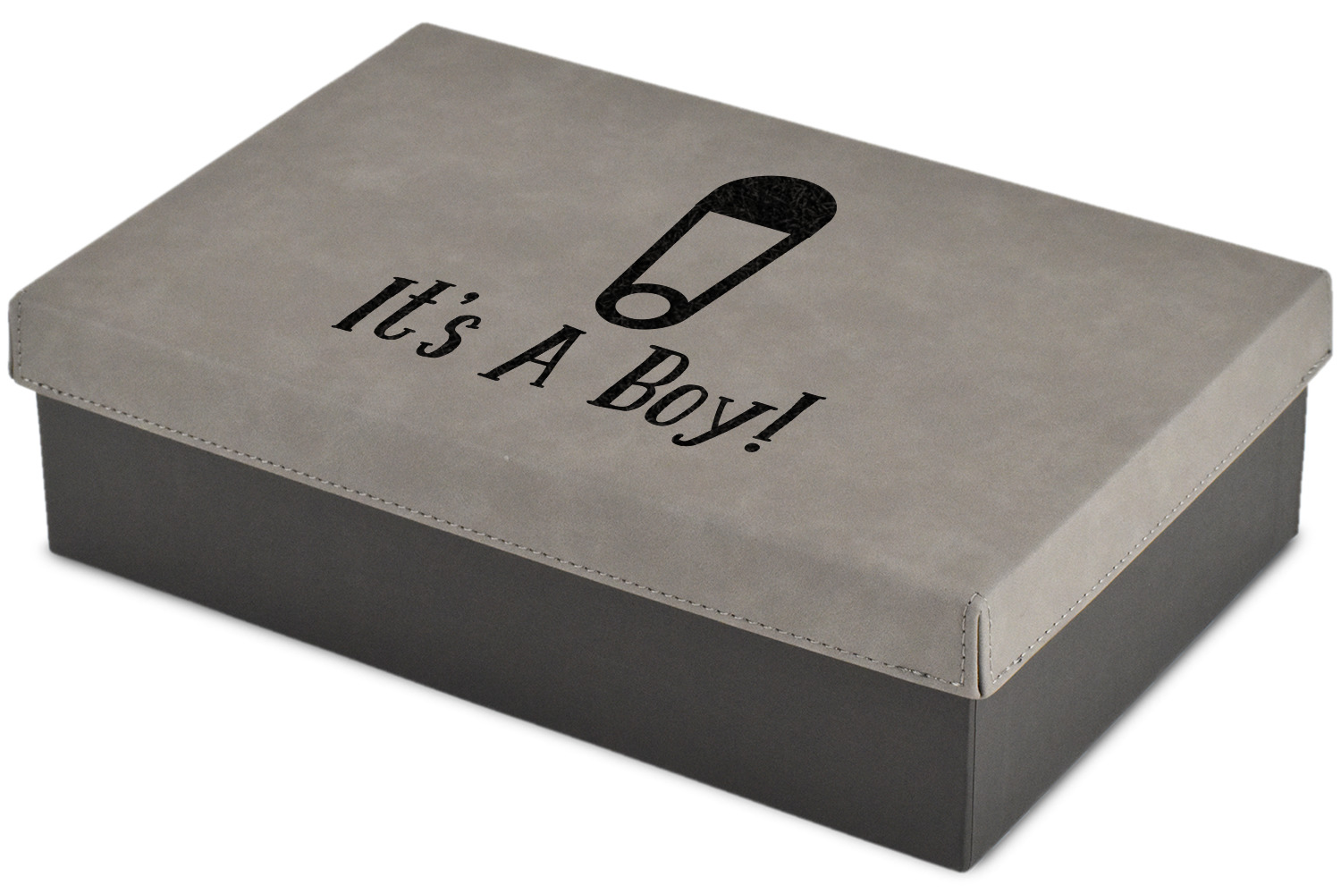 These gift boxes are available in 3 different sizes to accommodate various sized gifts. Available in gray as a neutral color for any occasion as well as to showcase your design boldly. Engraved with a laser this high quality paper board and faux leather gift box is unique and makes any gift stand out.