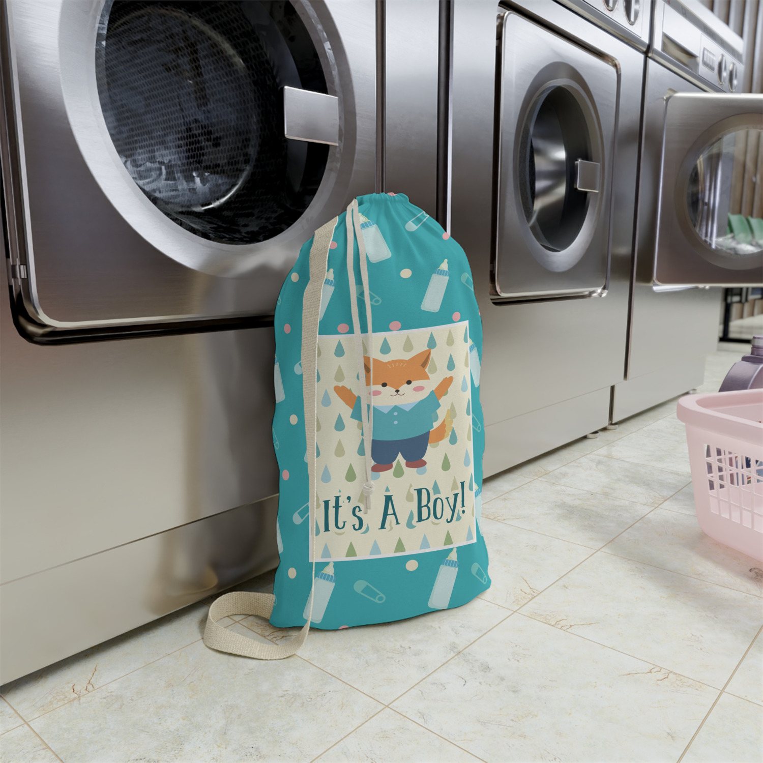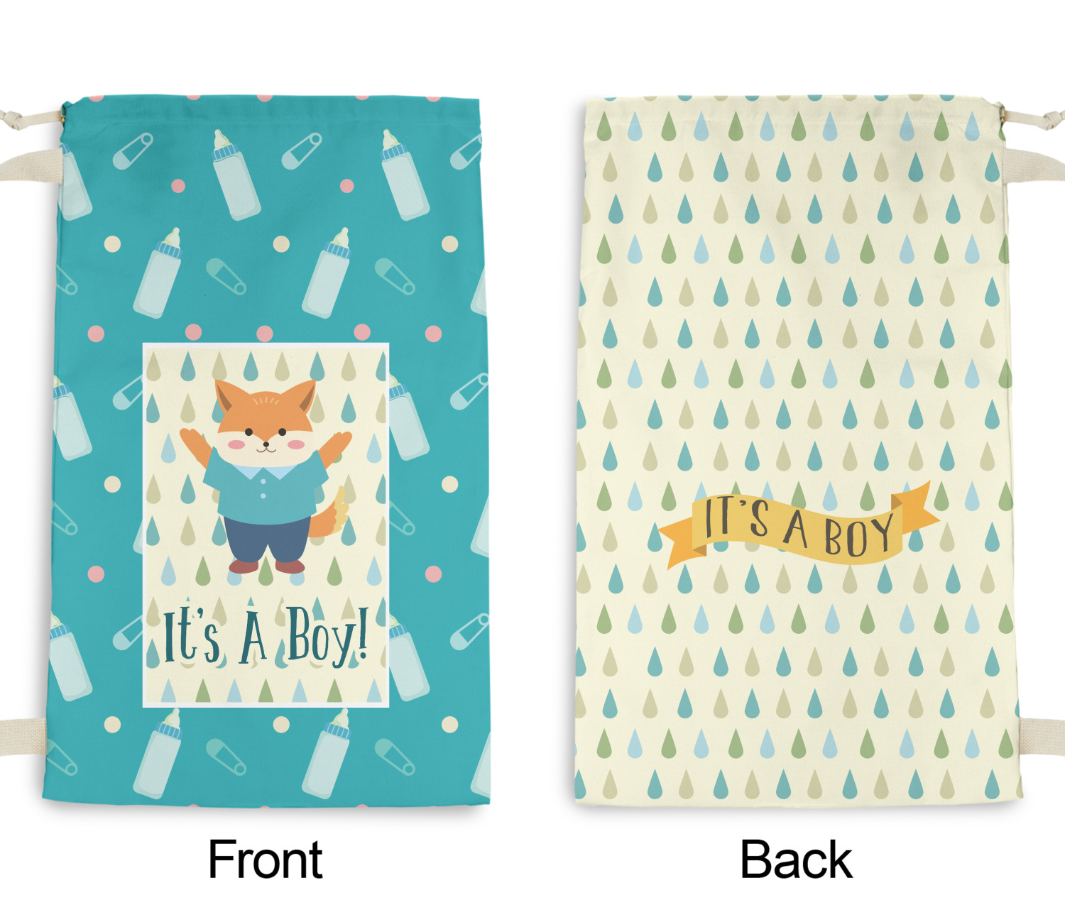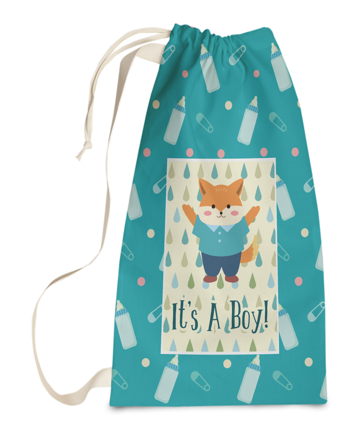 This design is for a new baby boy. The background is a bright teal color with baby bottles and safety pins. The secondary background has blue, teal, and green raindrops with a soft yellow behind them. The teal background almost acts as a frame around the yellow background. On the yellow background there is a fun little fox graphic celebrating with the words underneath him: "It's A Boy!"