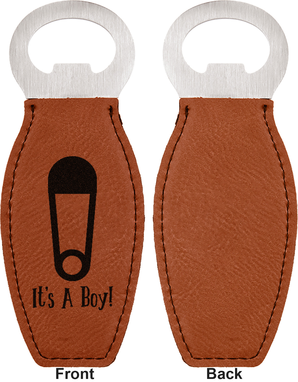 Built from stainless steel, these custom bottle openers are wrapped in a cognac-colored leatherette. Sharp, black stitching lines the edges for extra durability and a finished touch. Your personalization is laser-engraved onto the surface of this leatherette, leaving behind a crisp, black coloration. At 4.6 by 1.8 inches, this beer bottle opener gives you much of leverage when trying to open a stubborn bottle. On the opposite end of the opener, you'll find a magnet that you can use to display your new, unique bottle opener!