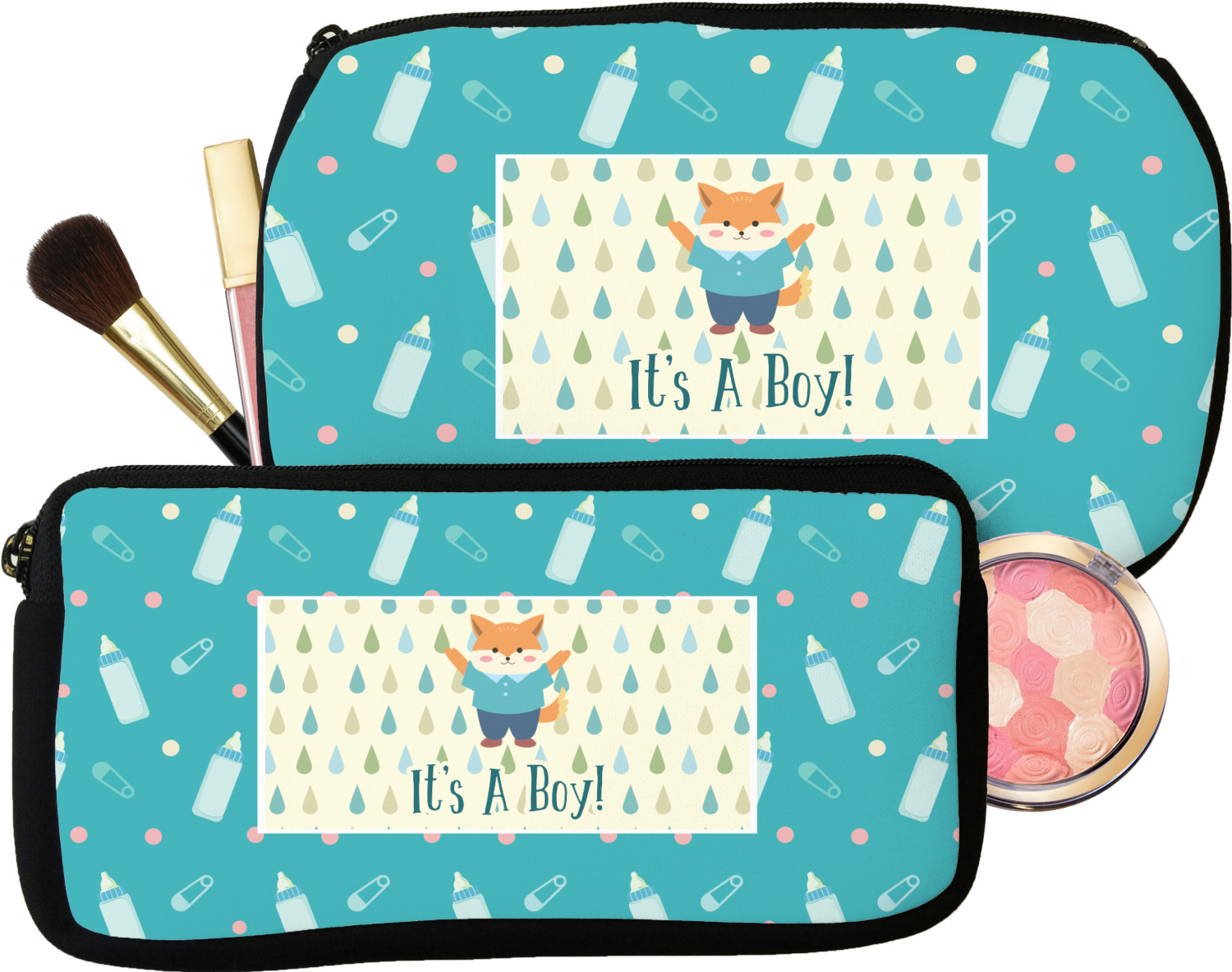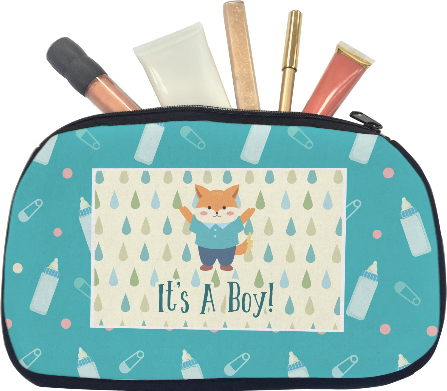 This design is for a new baby boy. The background is a bright teal color with baby bottles and safety pins. The secondary background has blue, teal, and green raindrops with a soft yellow behind them. The teal background almost acts as a frame around the yellow background. On the yellow background there is a fun little fox graphic celebrating with the words underneath him: "It's A Boy!"
