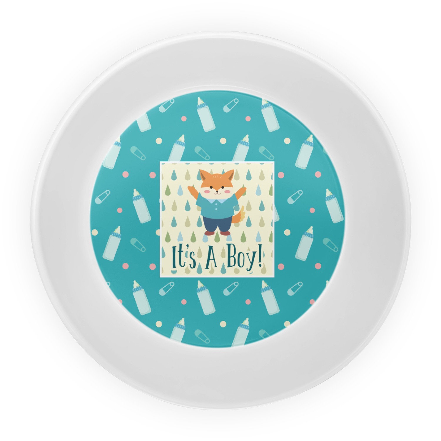 This design is for a new baby boy. The background is a bright teal color with baby bottles and safety pins. The secondary background has blue, teal, and green raindrops with a soft yellow behind them. The teal background almost acts as a frame around the yellow background. On the yellow background there is a fun little fox graphic celebrating with the words underneath him: "It's A Boy!"