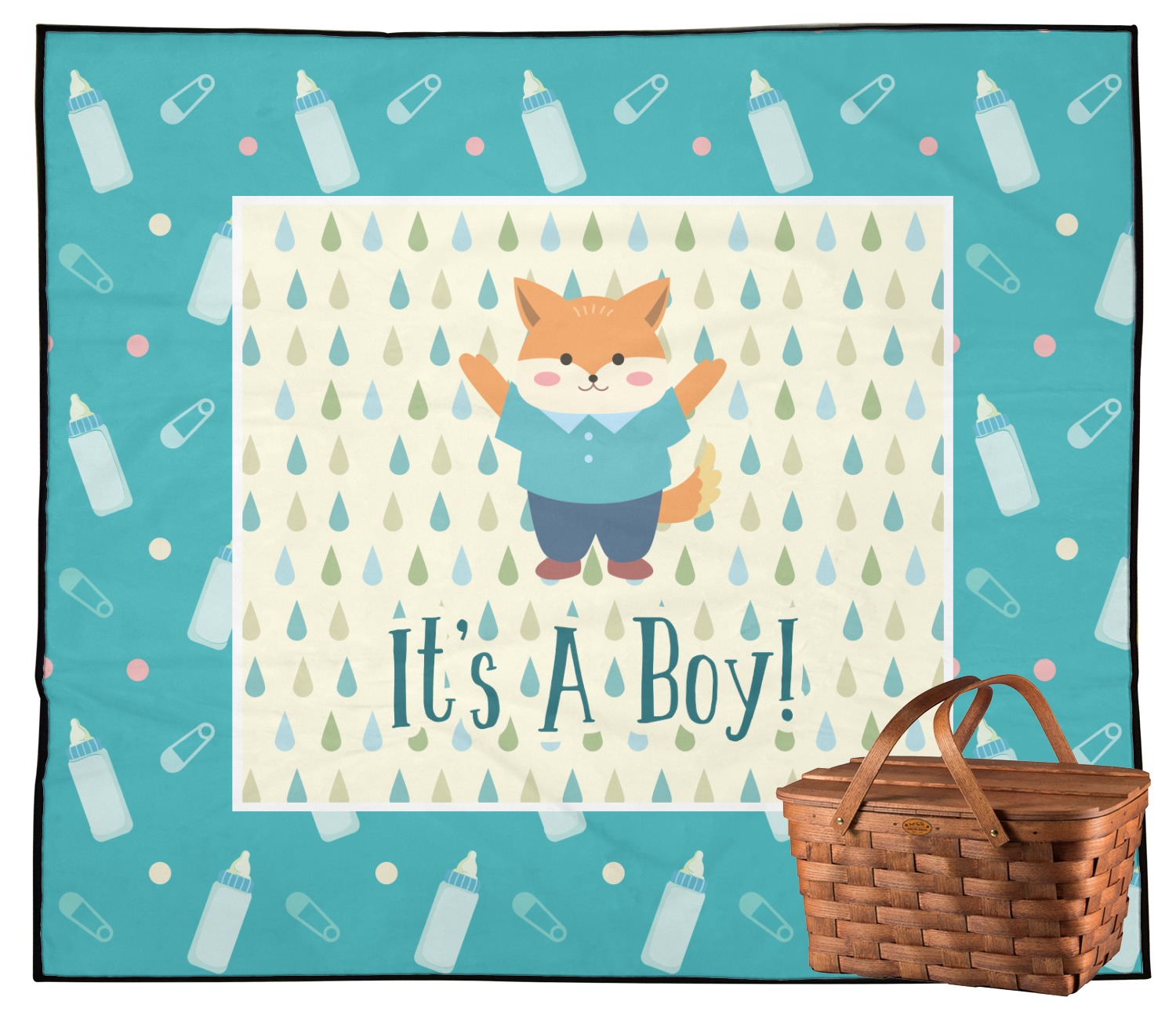 This design is for a new baby boy. The background is a bright teal color with baby bottles and safety pins. The secondary background has blue, teal, and green raindrops with a soft yellow behind them. The teal background almost acts as a frame around the yellow background. On the yellow background there is a fun little fox graphic celebrating with the words underneath him: "It's A Boy!"