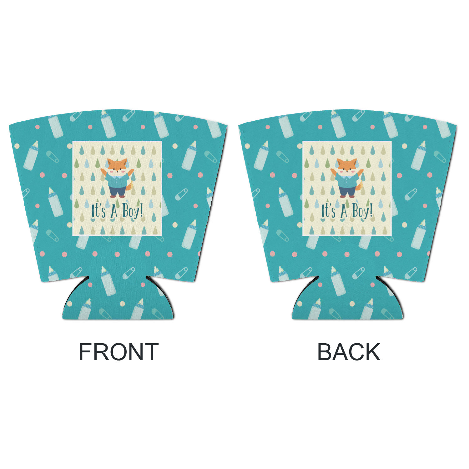 This design is for a new baby boy. The background is a bright teal color with baby bottles and safety pins. The secondary background has blue, teal, and green raindrops with a soft yellow behind them. The teal background almost acts as a frame around the yellow background. On the yellow background there is a fun little fox graphic celebrating with the words underneath him: "It's A Boy!"