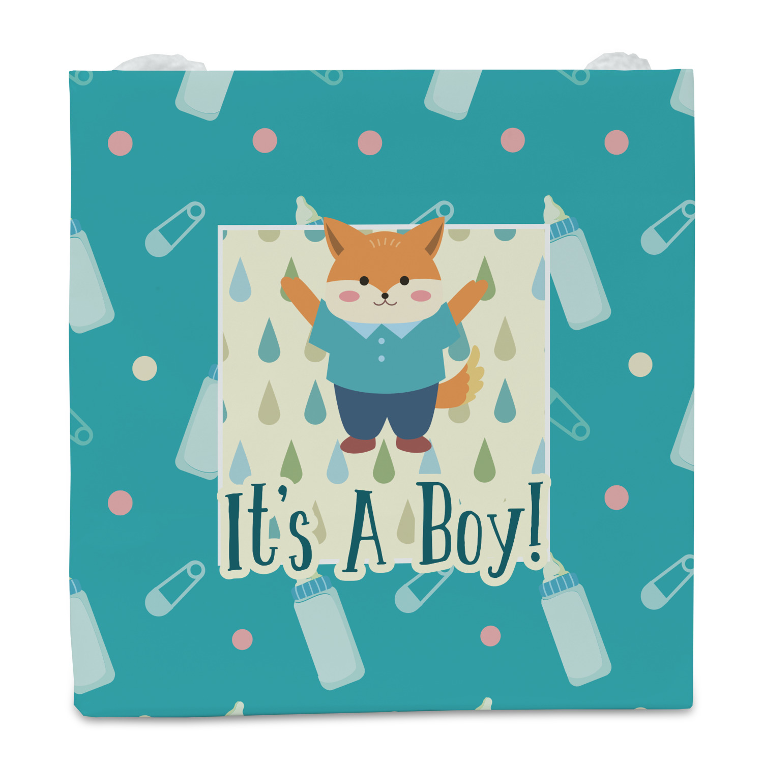 This design is for a new baby boy. The background is a bright teal color with baby bottles and safety pins. The secondary background has blue, teal, and green raindrops with a soft yellow behind them. The teal background almost acts as a frame around the yellow background. On the yellow background there is a fun little fox graphic celebrating with the words underneath him: "It's A Boy!"