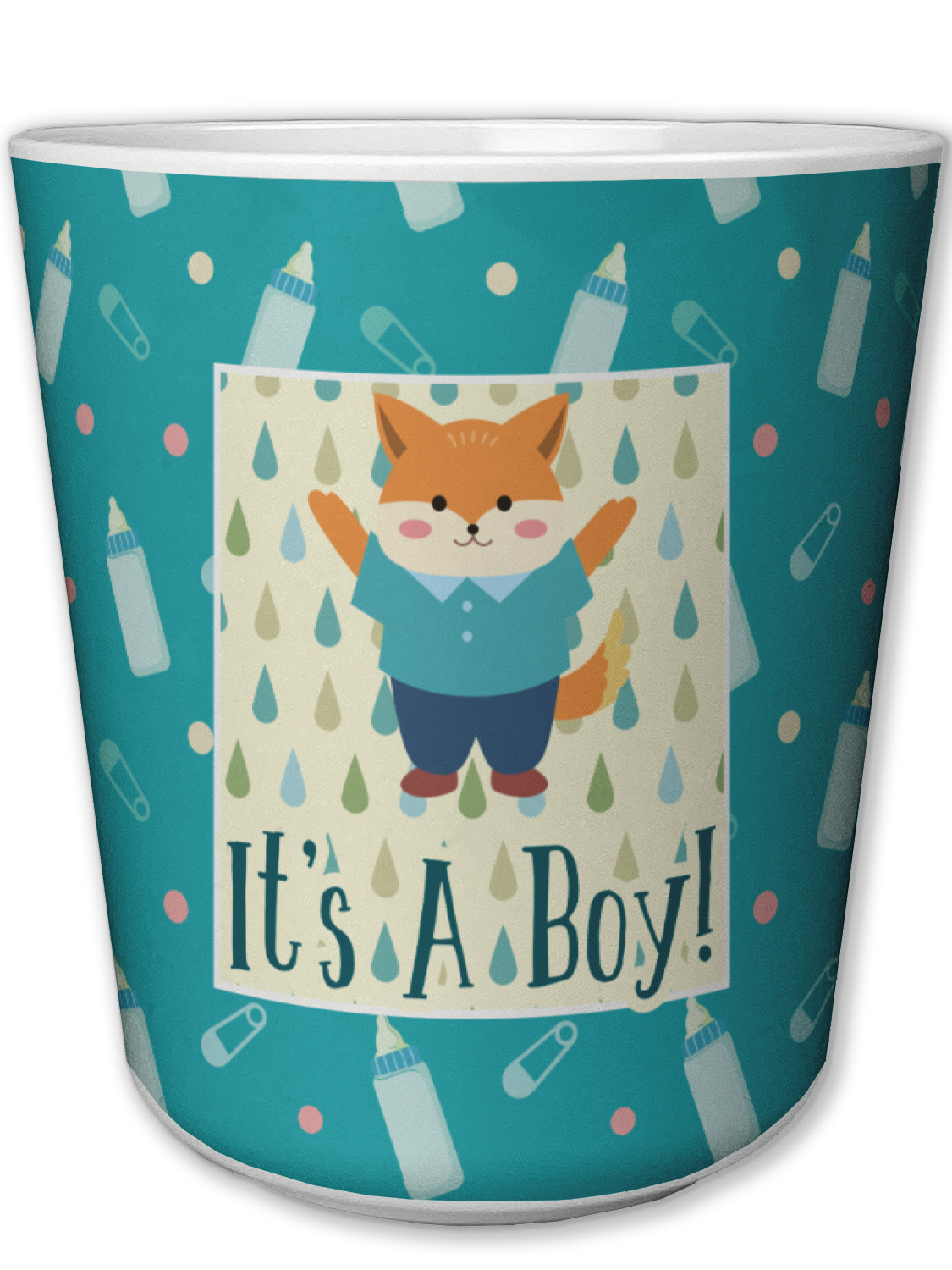 This design is for a new baby boy. The background is a bright teal color with baby bottles and safety pins. The secondary background has blue, teal, and green raindrops with a soft yellow behind them. The teal background almost acts as a frame around the yellow background. On the yellow background there is a fun little fox graphic celebrating with the words underneath him: "It's A Boy!"