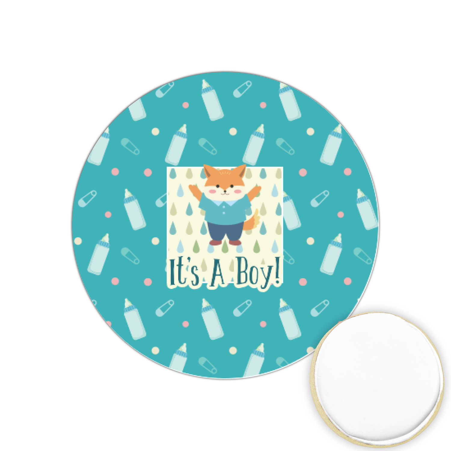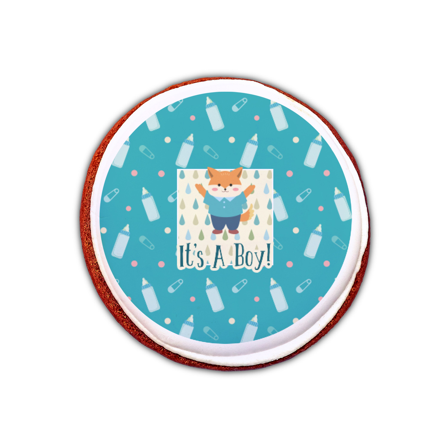 This design is for a new baby boy. The background is a bright teal color with baby bottles and safety pins. The secondary background has blue, teal, and green raindrops with a soft yellow behind them. The teal background almost acts as a frame around the yellow background. On the yellow background there is a fun little fox graphic celebrating with the words underneath him: "It's A Boy!"