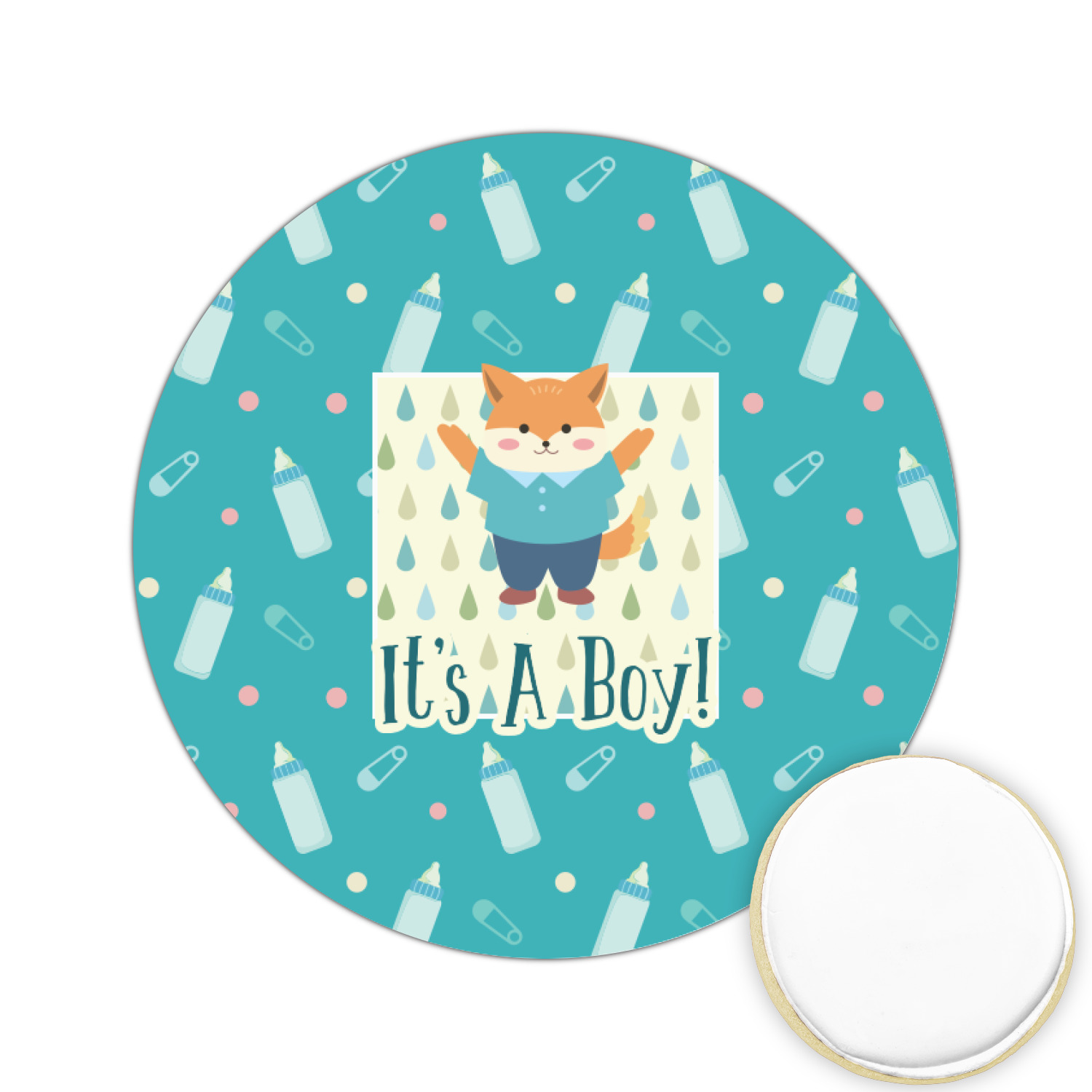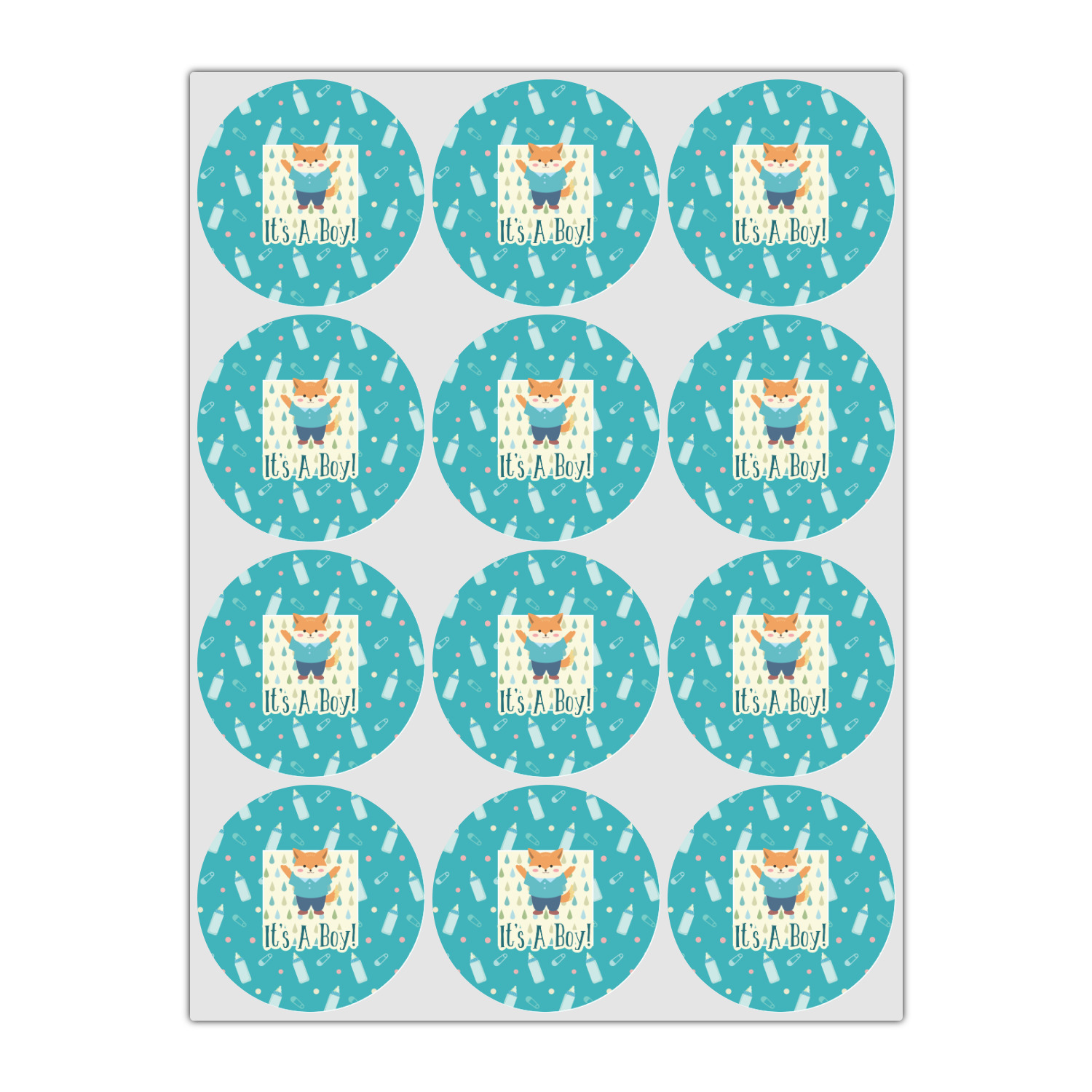 This design is for a new baby boy. The background is a bright teal color with baby bottles and safety pins. The secondary background has blue, teal, and green raindrops with a soft yellow behind them. The teal background almost acts as a frame around the yellow background. On the yellow background there is a fun little fox graphic celebrating with the words underneath him: "It's A Boy!"