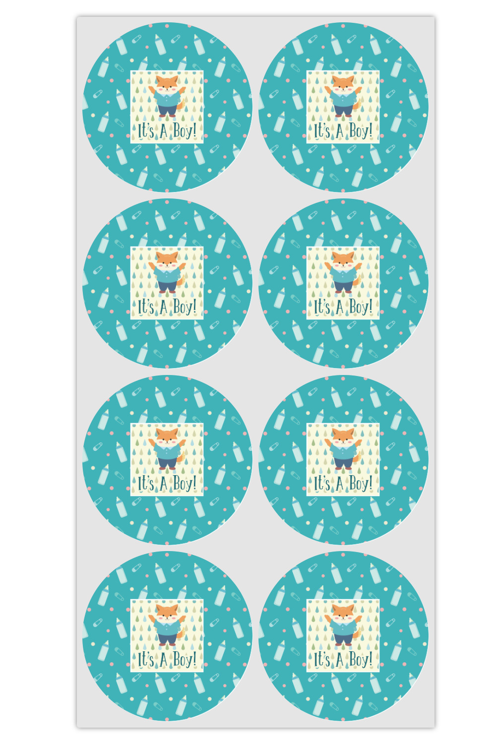 This design is for a new baby boy. The background is a bright teal color with baby bottles and safety pins. The secondary background has blue, teal, and green raindrops with a soft yellow behind them. The teal background almost acts as a frame around the yellow background. On the yellow background there is a fun little fox graphic celebrating with the words underneath him: "It's A Boy!"