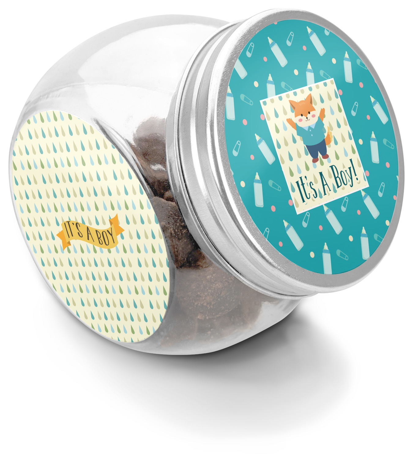 This design is for a new baby boy. The background is a bright teal color with baby bottles and safety pins. The secondary background has blue, teal, and green raindrops with a soft yellow behind them. The teal background almost acts as a frame around the yellow background. On the yellow background there is a fun little fox graphic celebrating with the words underneath him: "It's A Boy!"