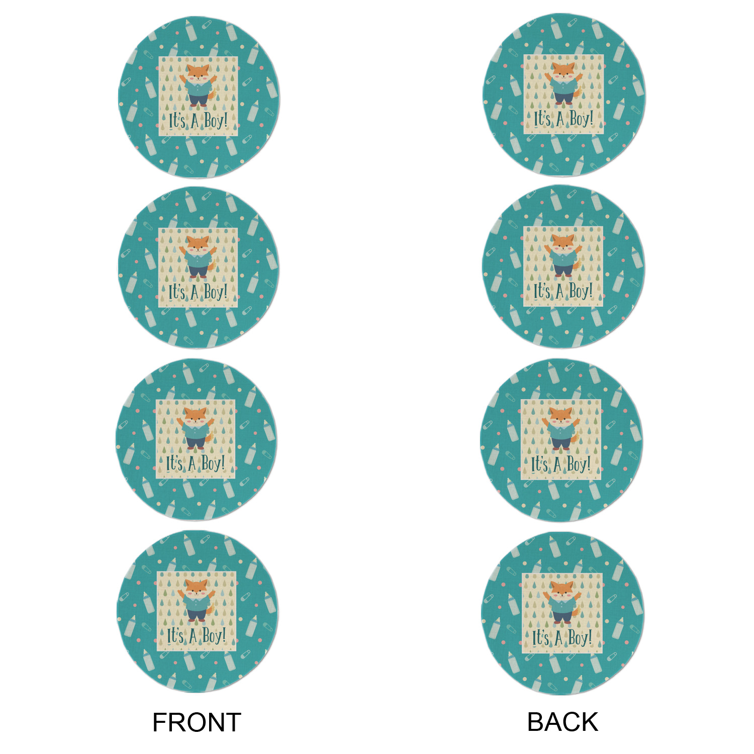 This design is for a new baby boy. The background is a bright teal color with baby bottles and safety pins. The secondary background has blue, teal, and green raindrops with a soft yellow behind them. The teal background almost acts as a frame around the yellow background. On the yellow background there is a fun little fox graphic celebrating with the words underneath him: "It's A Boy!"