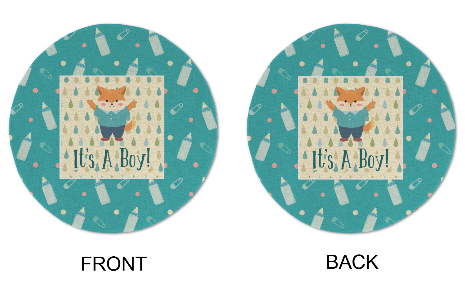 This design is for a new baby boy. The background is a bright teal color with baby bottles and safety pins. The secondary background has blue, teal, and green raindrops with a soft yellow behind them. The teal background almost acts as a frame around the yellow background. On the yellow background there is a fun little fox graphic celebrating with the words underneath him: "It's A Boy!"