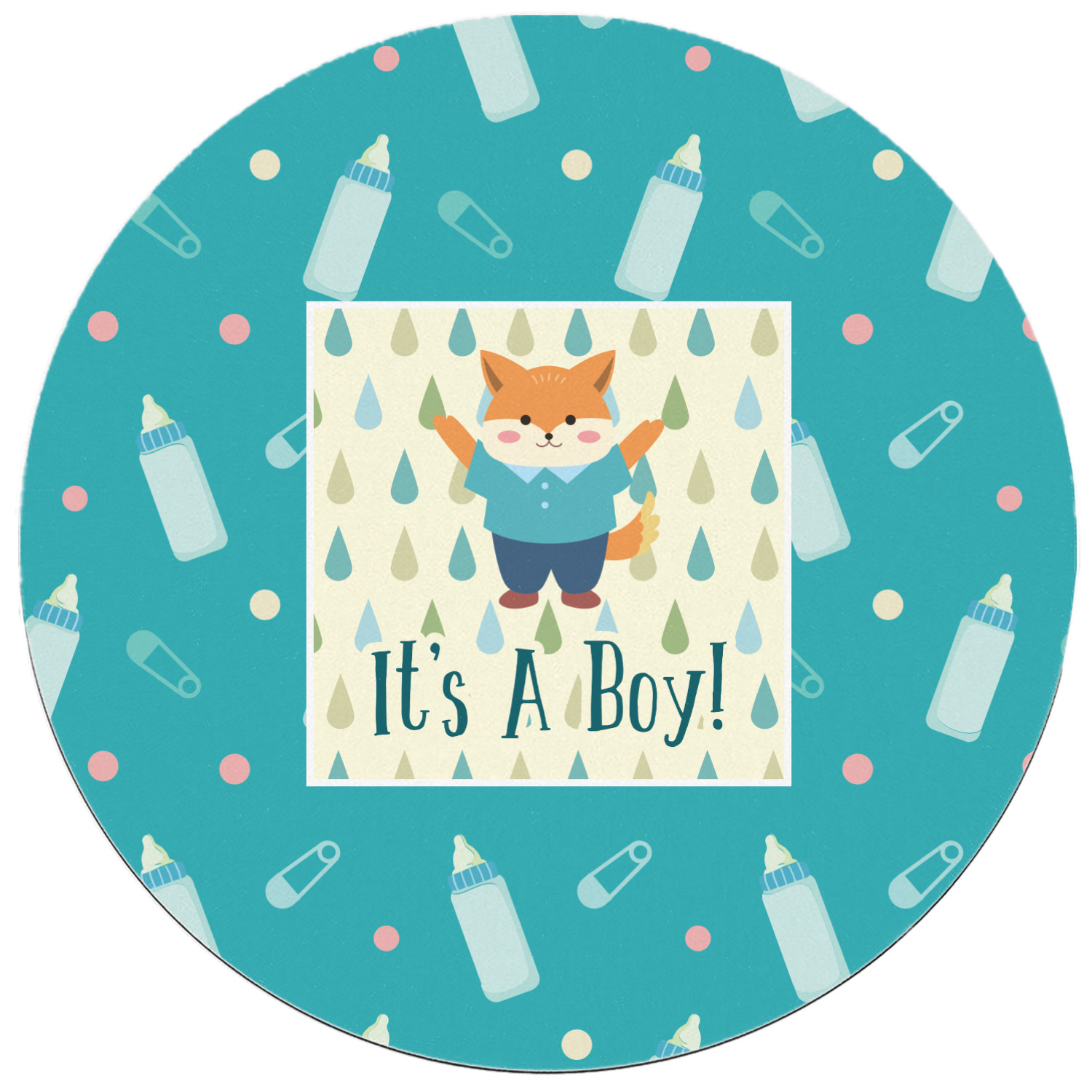 This design is for a new baby boy. The background is a bright teal color with baby bottles and safety pins. The secondary background has blue, teal, and green raindrops with a soft yellow behind them. The teal background almost acts as a frame around the yellow background. On the yellow background there is a fun little fox graphic celebrating with the words underneath him: "It's A Boy!"