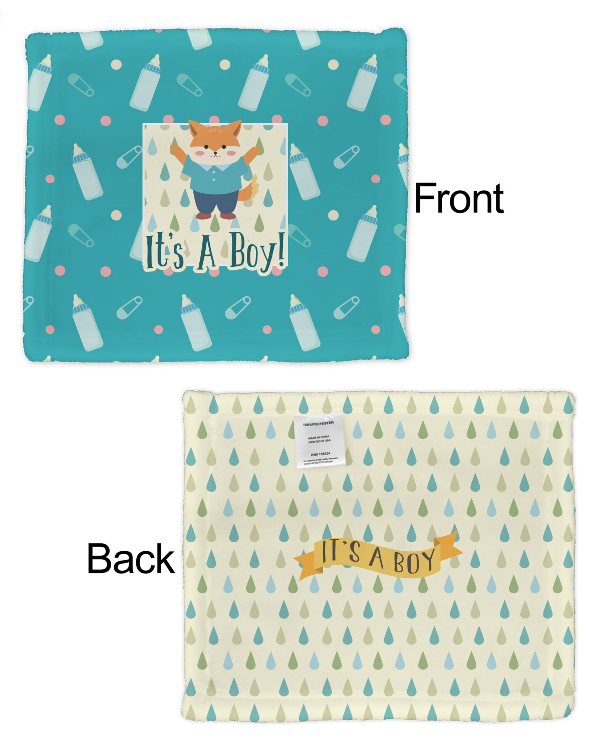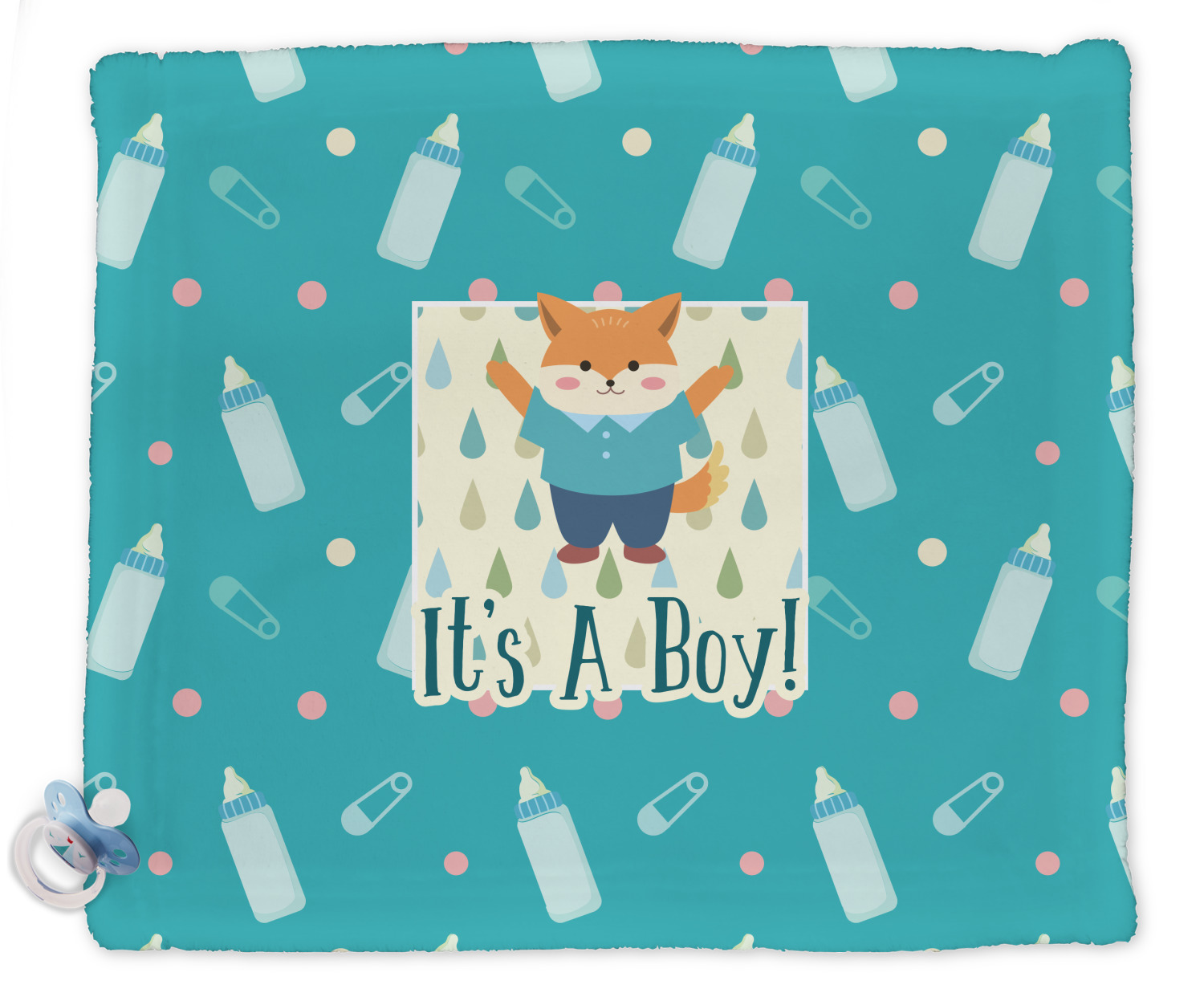 This design is for a new baby boy. The background is a bright teal color with baby bottles and safety pins. The secondary background has blue, teal, and green raindrops with a soft yellow behind them. The teal background almost acts as a frame around the yellow background. On the yellow background there is a fun little fox graphic celebrating with the words underneath him: "It's A Boy!"