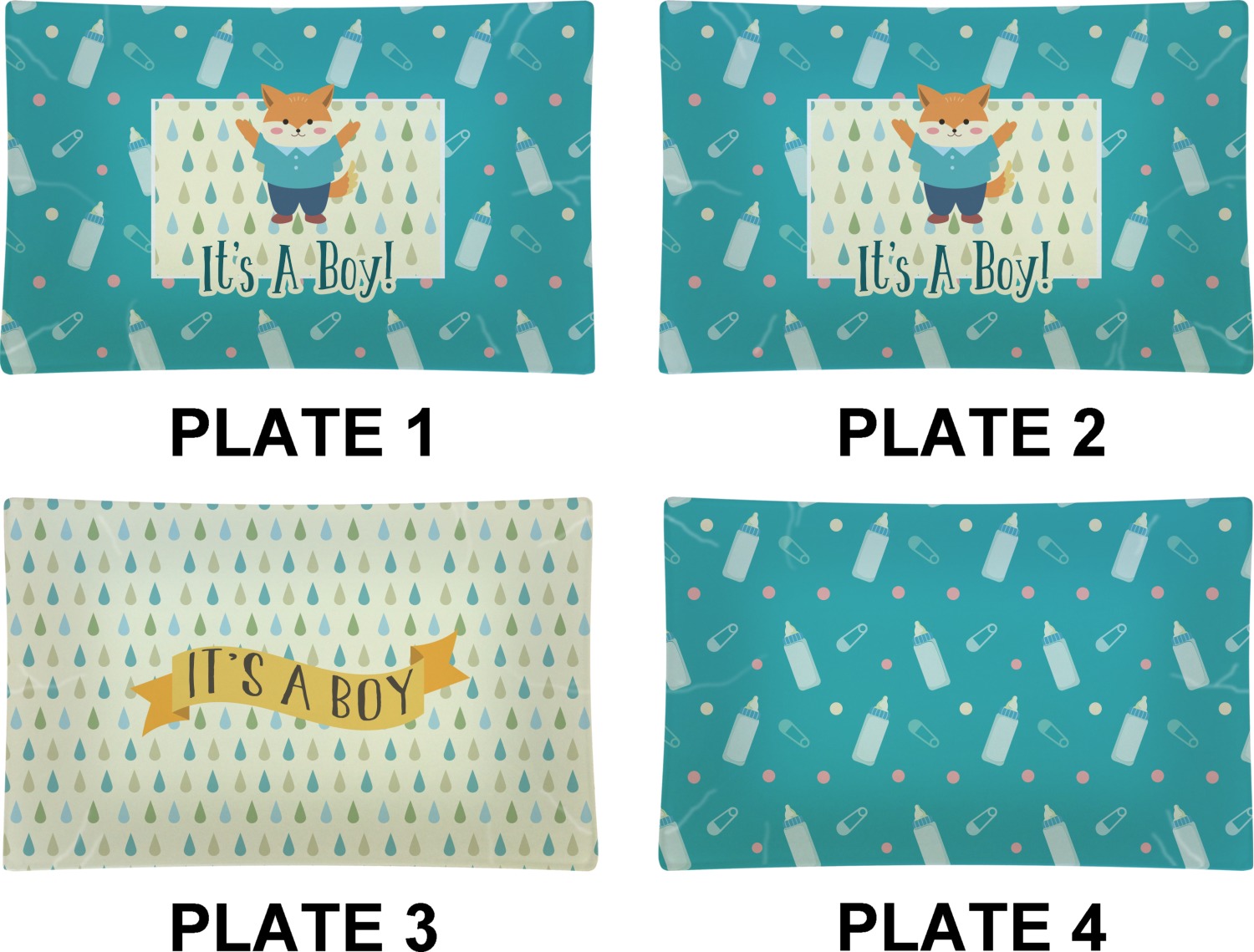 This design is for a new baby boy. The background is a bright teal color with baby bottles and safety pins. The secondary background has blue, teal, and green raindrops with a soft yellow behind them. The teal background almost acts as a frame around the yellow background. On the yellow background there is a fun little fox graphic celebrating with the words underneath him: "It's A Boy!"