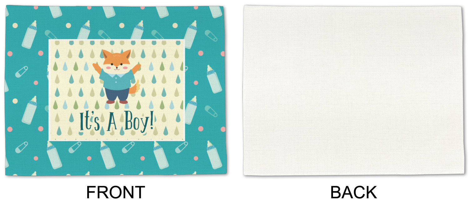This design is for a new baby boy. The background is a bright teal color with baby bottles and safety pins. The secondary background has blue, teal, and green raindrops with a soft yellow behind them. The teal background almost acts as a frame around the yellow background. On the yellow background there is a fun little fox graphic celebrating with the words underneath him: "It's A Boy!"