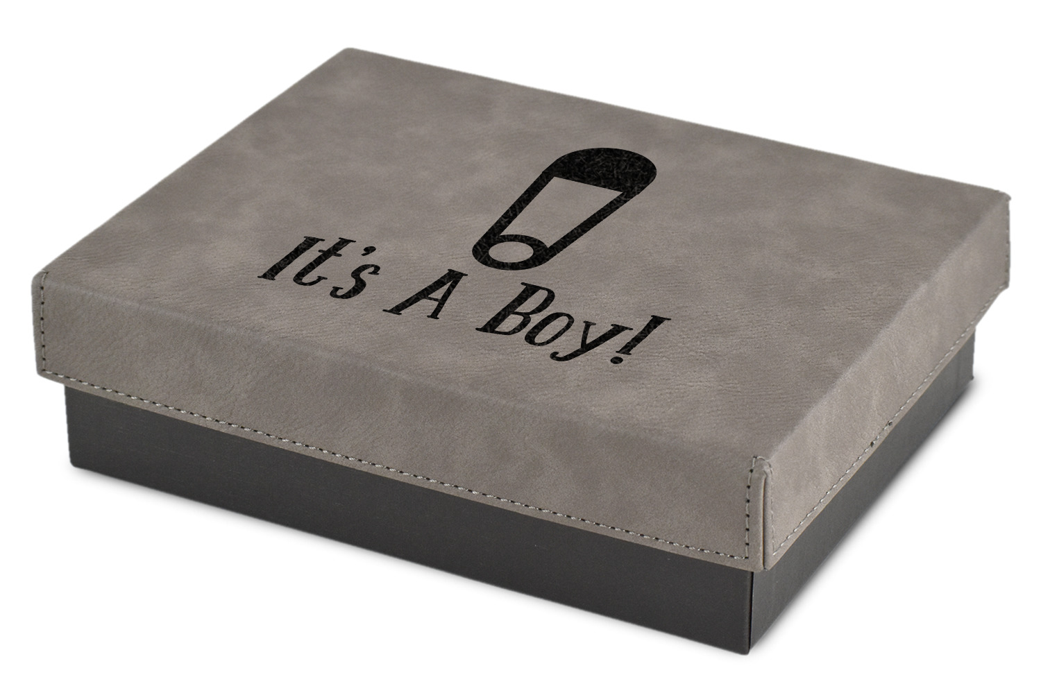 These gift boxes are available in 3 different sizes to accommodate various sized gifts. Available in gray as a neutral color for any occasion as well as to showcase your design boldly. Engraved with a laser this high quality paper board and faux leather gift box is unique and makes any gift stand out.