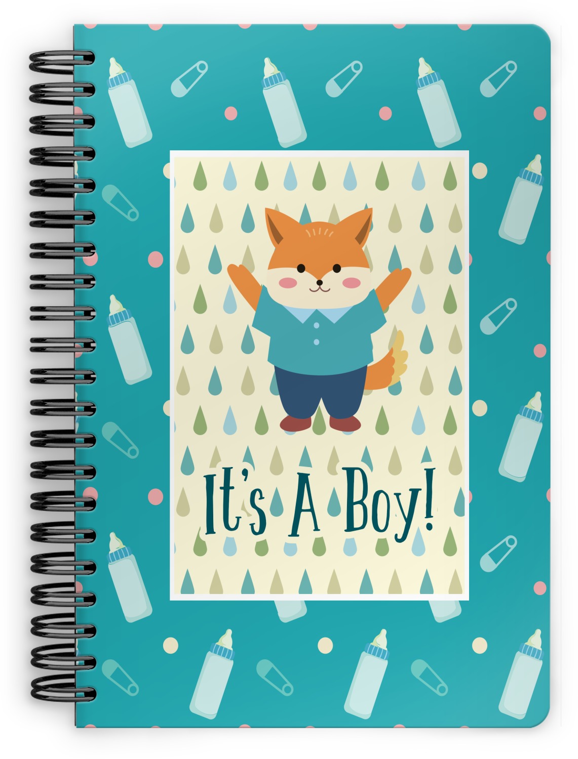 This design is for a new baby boy. The background is a bright teal color with baby bottles and safety pins. The secondary background has blue, teal, and green raindrops with a soft yellow behind them. The teal background almost acts as a frame around the yellow background. On the yellow background there is a fun little fox graphic celebrating with the words underneath him: "It's A Boy!"