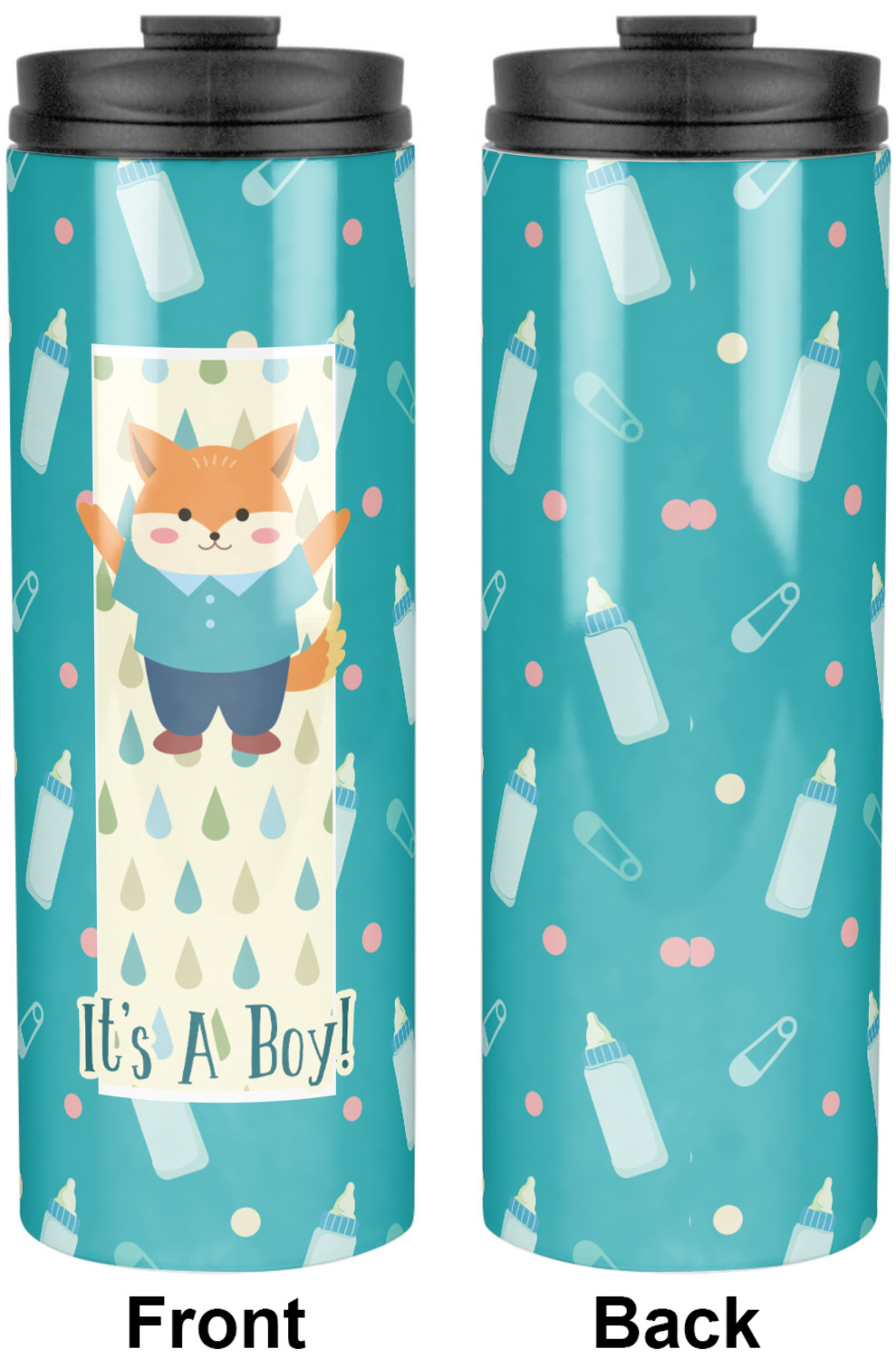 This design is for a new baby boy. The background is a bright teal color with baby bottles and safety pins. The secondary background has blue, teal, and green raindrops with a soft yellow behind them. The teal background almost acts as a frame around the yellow background. On the yellow background there is a fun little fox graphic celebrating with the words underneath him: "It's A Boy!"