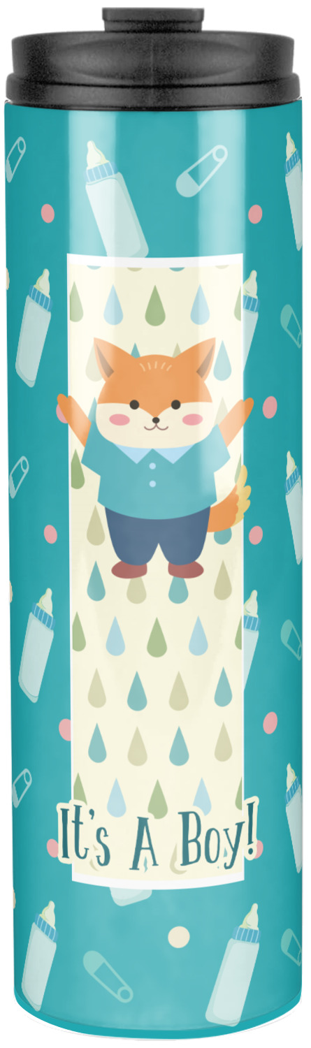 This design is for a new baby boy. The background is a bright teal color with baby bottles and safety pins. The secondary background has blue, teal, and green raindrops with a soft yellow behind them. The teal background almost acts as a frame around the yellow background. On the yellow background there is a fun little fox graphic celebrating with the words underneath him: "It's A Boy!"