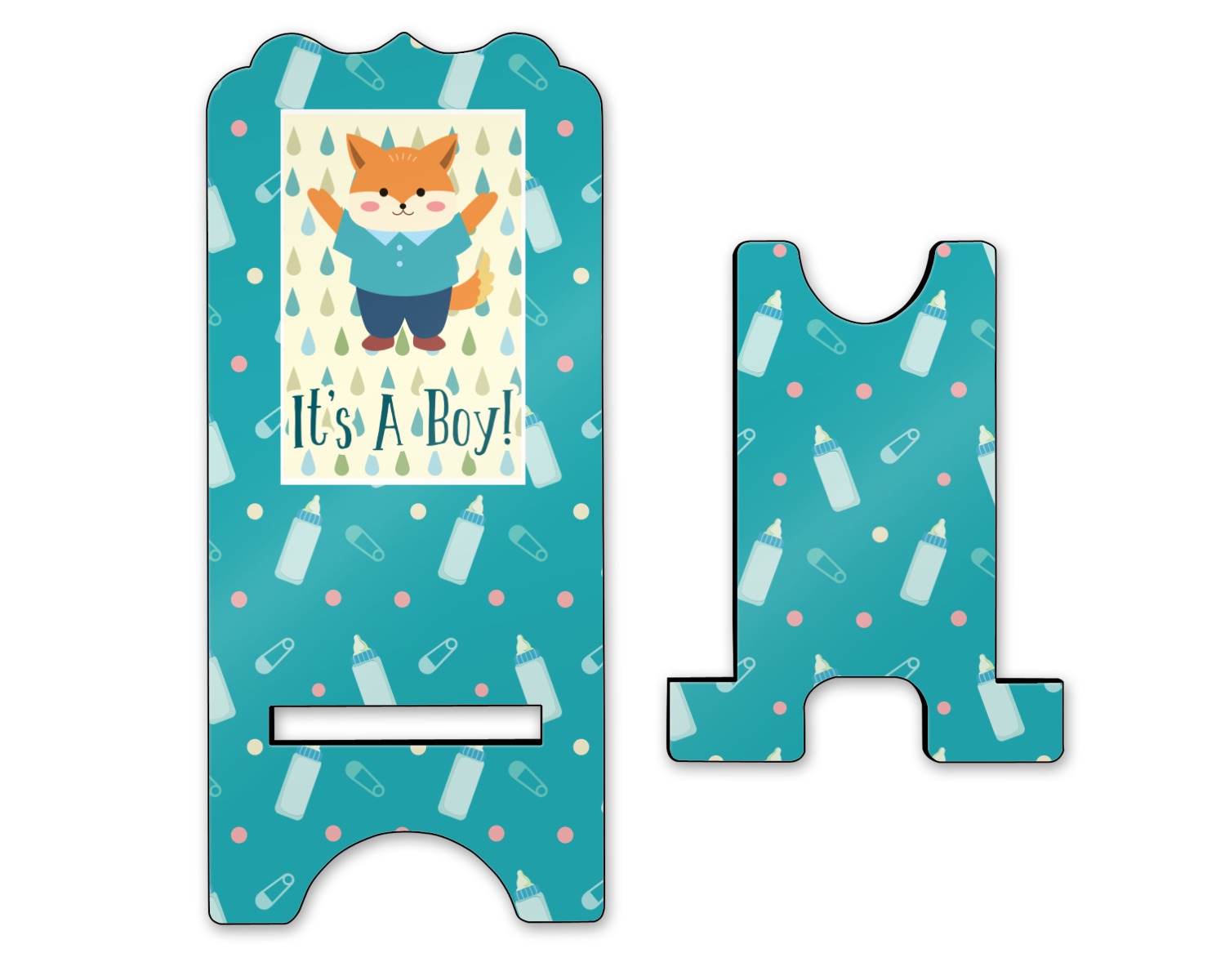 This design is for a new baby boy. The background is a bright teal color with baby bottles and safety pins. The secondary background has blue, teal, and green raindrops with a soft yellow behind them. The teal background almost acts as a frame around the yellow background. On the yellow background there is a fun little fox graphic celebrating with the words underneath him: "It's A Boy!"