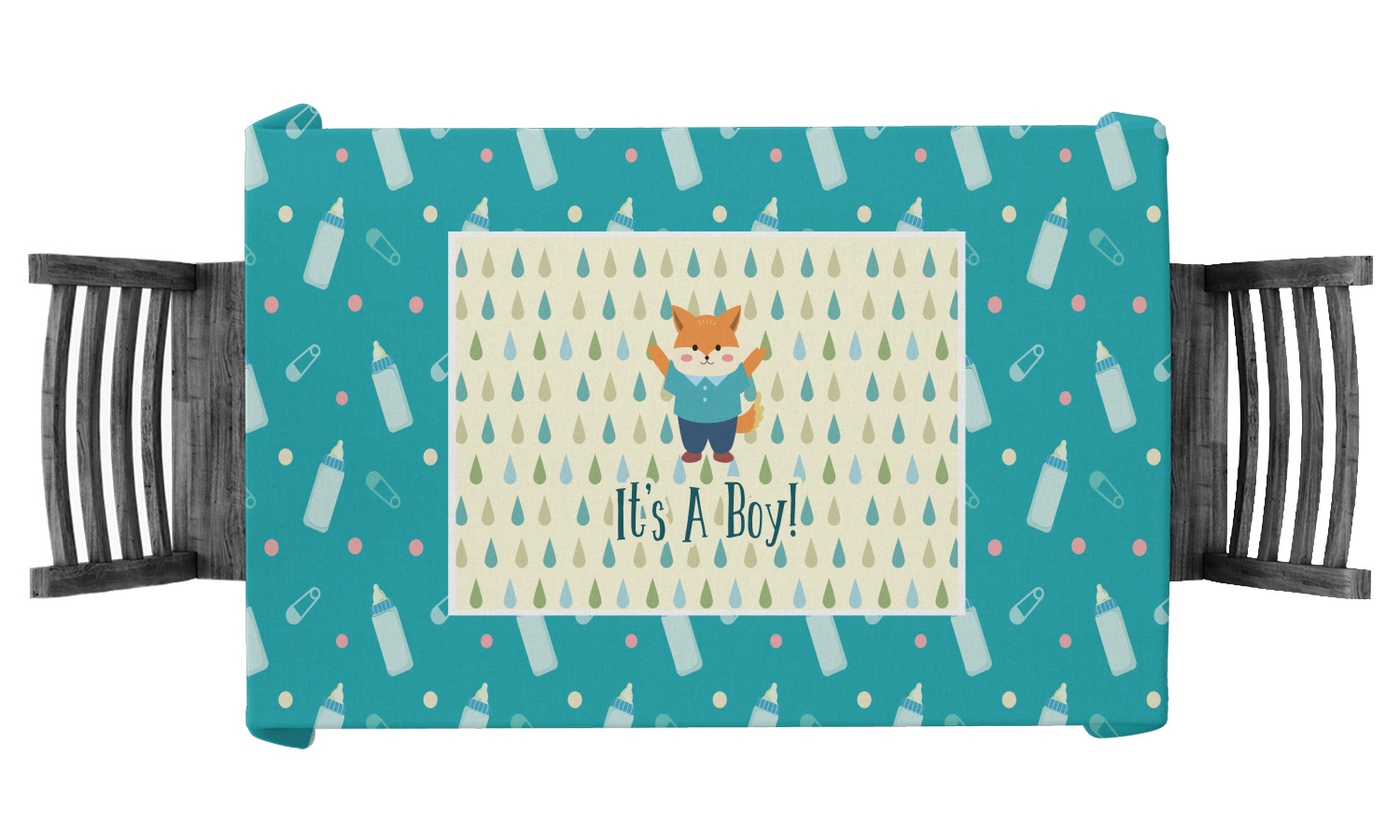 This design is for a new baby boy. The background is a bright teal color with baby bottles and safety pins. The secondary background has blue, teal, and green raindrops with a soft yellow behind them. The teal background almost acts as a frame around the yellow background. On the yellow background there is a fun little fox graphic celebrating with the words underneath him: "It's A Boy!"