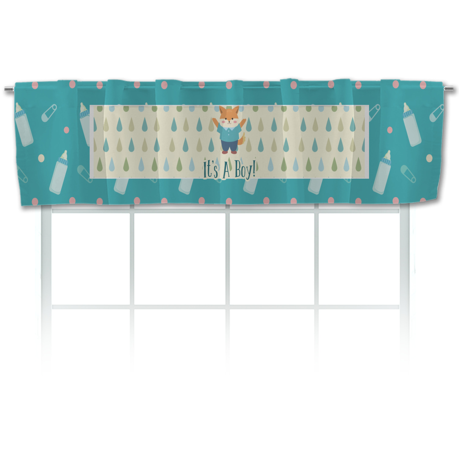 This design is for a new baby boy. The background is a bright teal color with baby bottles and safety pins. The secondary background has blue, teal, and green raindrops with a soft yellow behind them. The teal background almost acts as a frame around the yellow background. On the yellow background there is a fun little fox graphic celebrating with the words underneath him: "It's A Boy!"