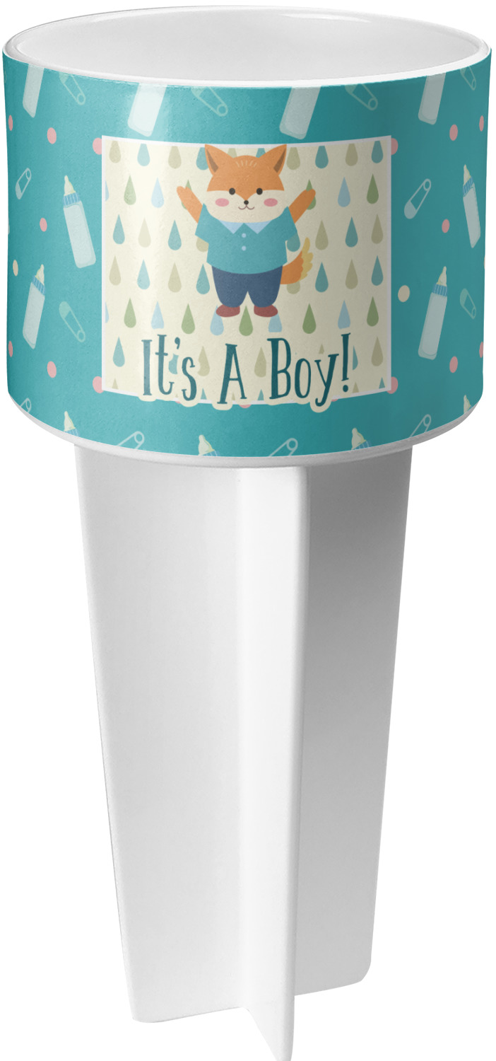 This cup holder has a large stake at its bottom that anchors it to the sand or ground below, while the cup holder rests above the stake. The entire drink holder is made of durable plastic and displays your customization around the cup holder portion. We sell these personalized beach spikers in two different colors: black and white.