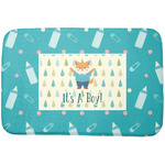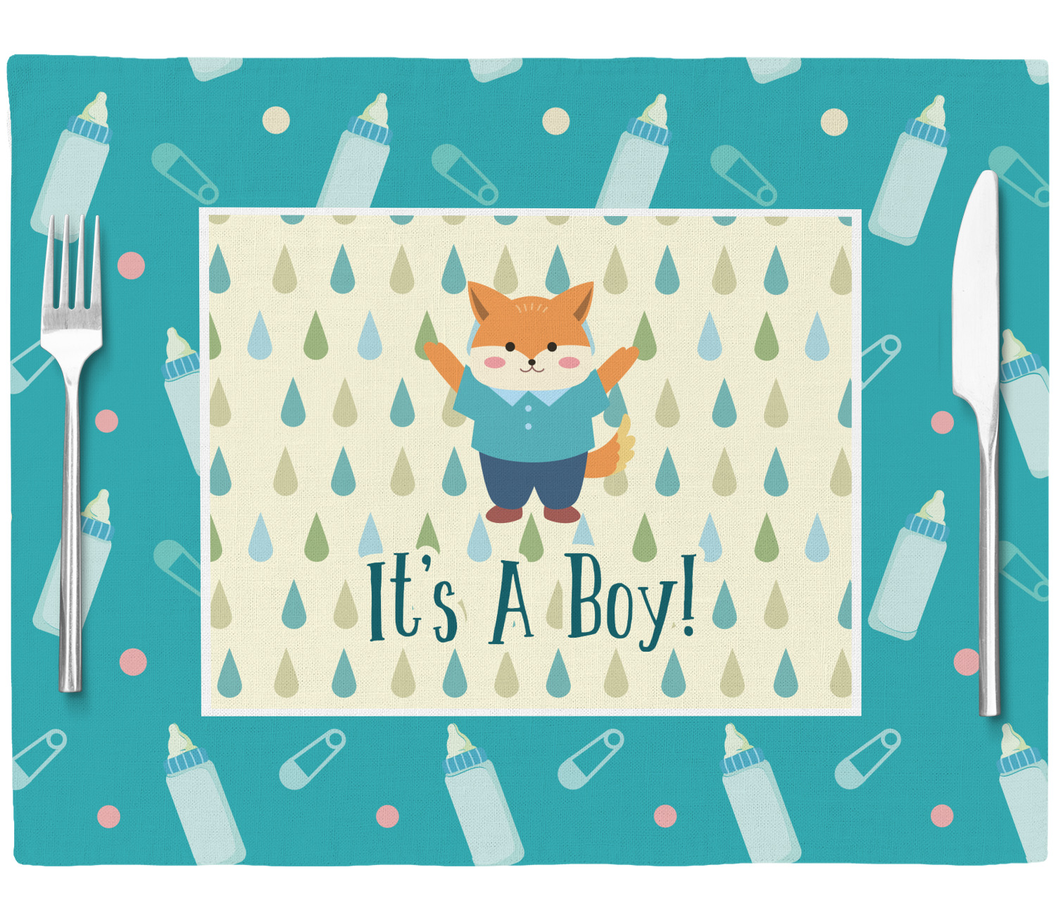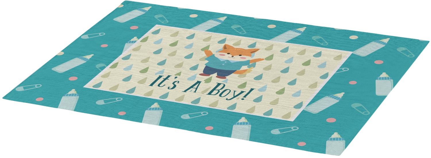 This design is for a new baby boy. The background is a bright teal color with baby bottles and safety pins. The secondary background has blue, teal, and green raindrops with a soft yellow behind them. The teal background almost acts as a frame around the yellow background. On the yellow background there is a fun little fox graphic celebrating with the words underneath him: "It's A Boy!"