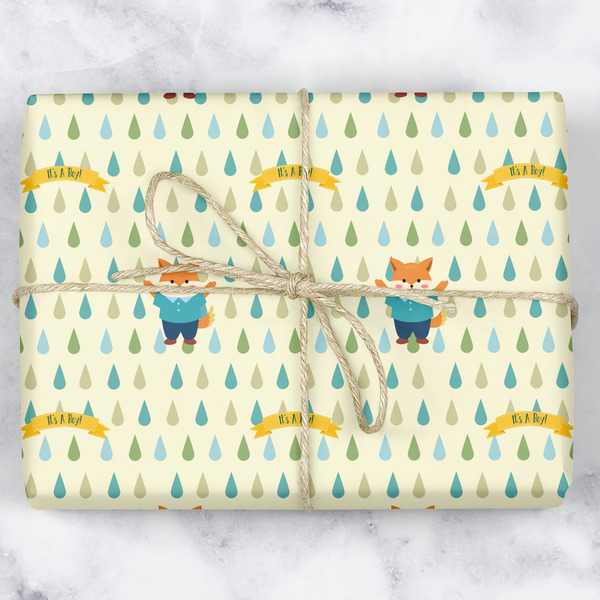 This design is for a new baby boy. The background is a bright teal color with baby bottles and safety pins. The secondary background has blue, teal, and green raindrops with a soft yellow behind them. The teal background almost acts as a frame around the yellow background. On the yellow background there is a fun little fox graphic celebrating with the words underneath him: "It's A Boy!"