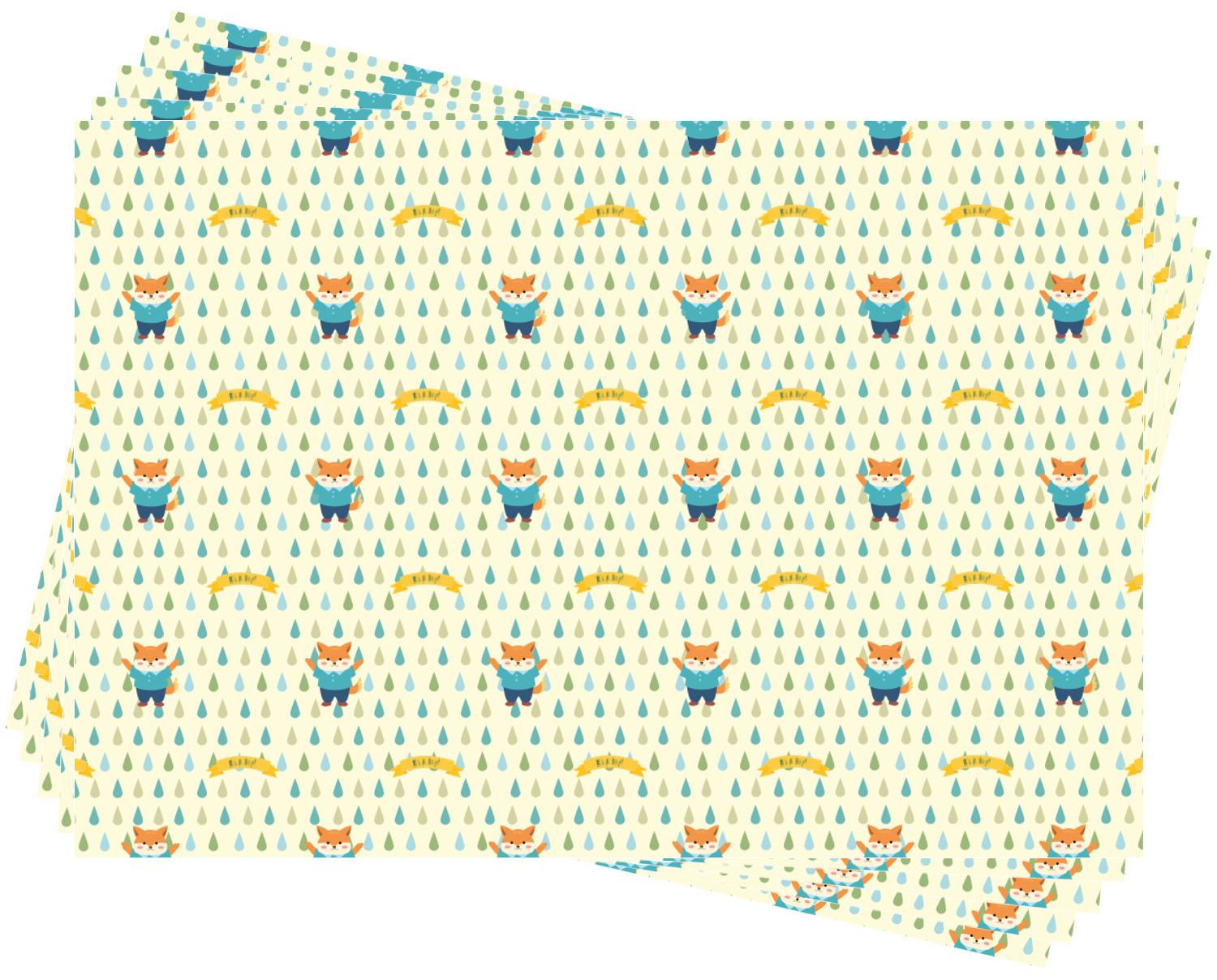 This design is for a new baby boy. The background is a bright teal color with baby bottles and safety pins. The secondary background has blue, teal, and green raindrops with a soft yellow behind them. The teal background almost acts as a frame around the yellow background. On the yellow background there is a fun little fox graphic celebrating with the words underneath him: "It's A Boy!"