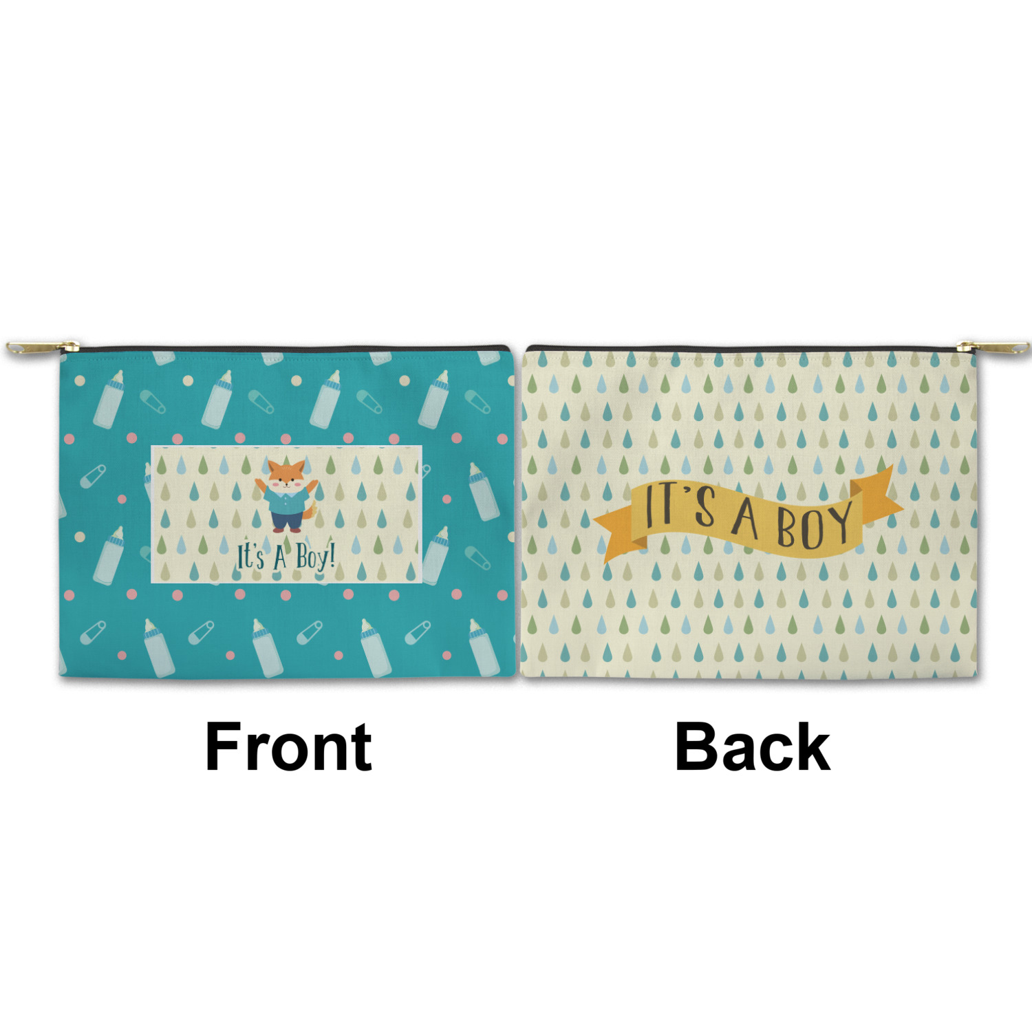 This design is for a new baby boy. The background is a bright teal color with baby bottles and safety pins. The secondary background has blue, teal, and green raindrops with a soft yellow behind them. The teal background almost acts as a frame around the yellow background. On the yellow background there is a fun little fox graphic celebrating with the words underneath him: "It's A Boy!"