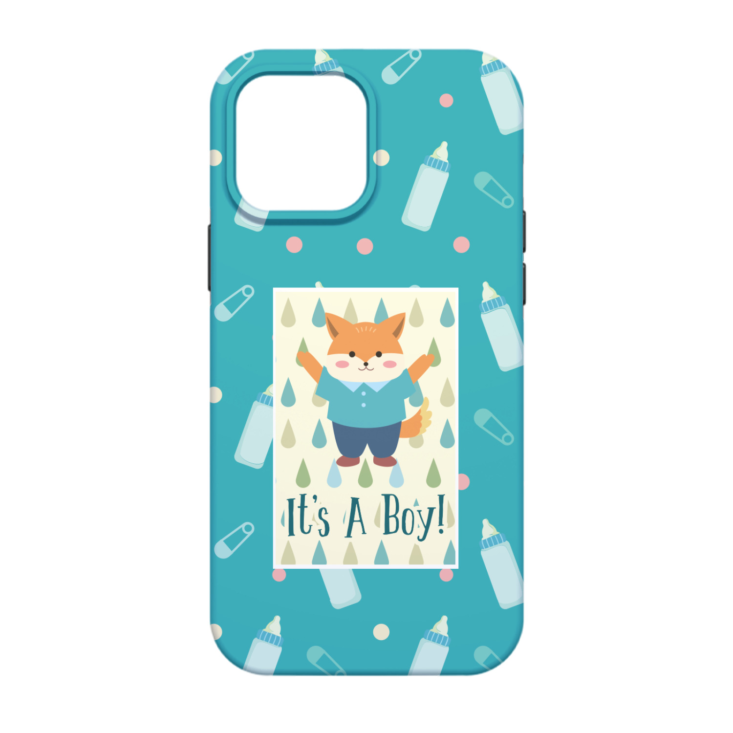 This design is for a new baby boy. The background is a bright teal color with baby bottles and safety pins. The secondary background has blue, teal, and green raindrops with a soft yellow behind them. The teal background almost acts as a frame around the yellow background. On the yellow background there is a fun little fox graphic celebrating with the words underneath him: "It's A Boy!"