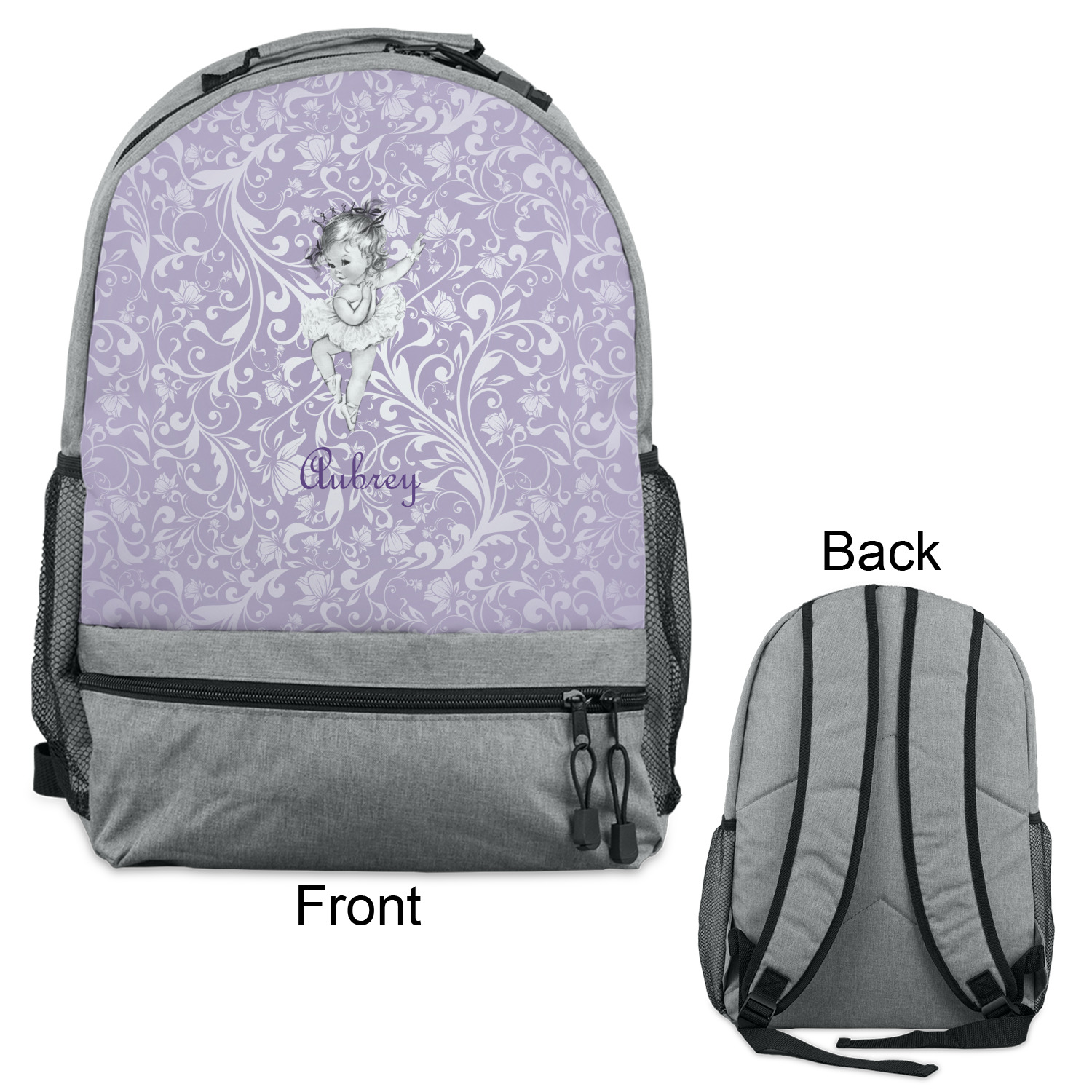 Our ballerina design is simply stunning and is perfect for the baby or little girl that is going to grow up to be a ballerina. We have create yet another layered design. The background is a beautiful, elegant floral pattern that we have done purple/lavender tone on tone color. Our second background is a subtle radial fill to highlight our beautiful ballerina. In the foreground, we have our beautiful vintage ballerina. For personalization, we added her name in a simple upright script font.