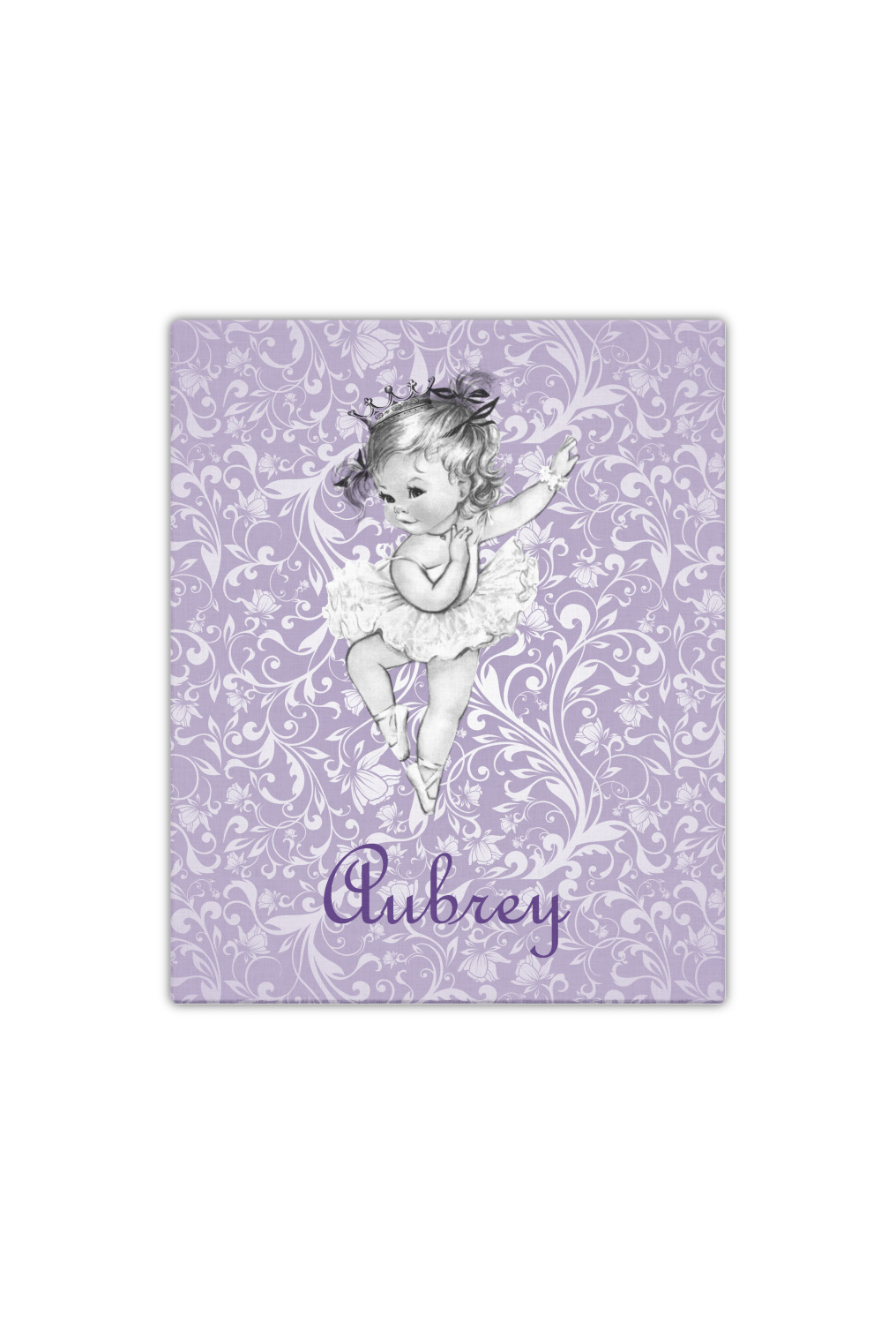 Our ballerina design is simply stunning and is perfect for the baby or little girl that is going to grow up to be a ballerina. We have create yet another layered design. The background is a beautiful, elegant floral pattern that we have done purple/lavender tone on tone color. Our second background is a subtle radial fill to highlight our beautiful ballerina. In the foreground, we have our beautiful vintage ballerina. For personalization, we added her name in a simple upright script font.