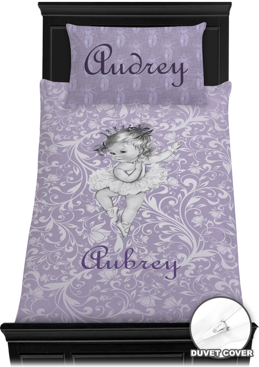 Our ballerina design is simply stunning and is perfect for the baby or little girl that is going to grow up to be a ballerina. We have create yet another layered design. The background is a beautiful, elegant floral pattern that we have done purple/lavender tone on tone color. Our second background is a subtle radial fill to highlight our beautiful ballerina. In the foreground, we have our beautiful vintage ballerina. For personalization, we added her name in a simple upright script font.