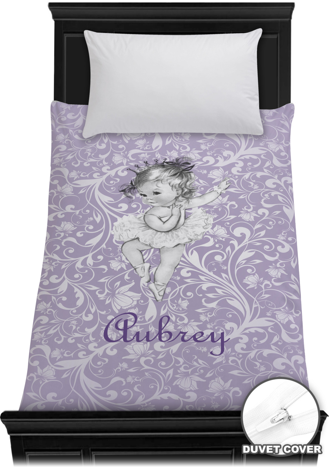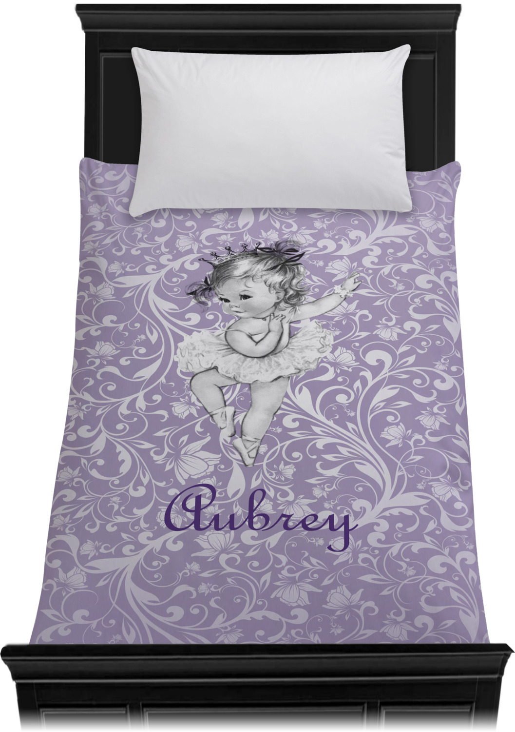 Our ballerina design is simply stunning and is perfect for the baby or little girl that is going to grow up to be a ballerina. We have create yet another layered design. The background is a beautiful, elegant floral pattern that we have done purple/lavender tone on tone color. Our second background is a subtle radial fill to highlight our beautiful ballerina. In the foreground, we have our beautiful vintage ballerina. For personalization, we added her name in a simple upright script font.