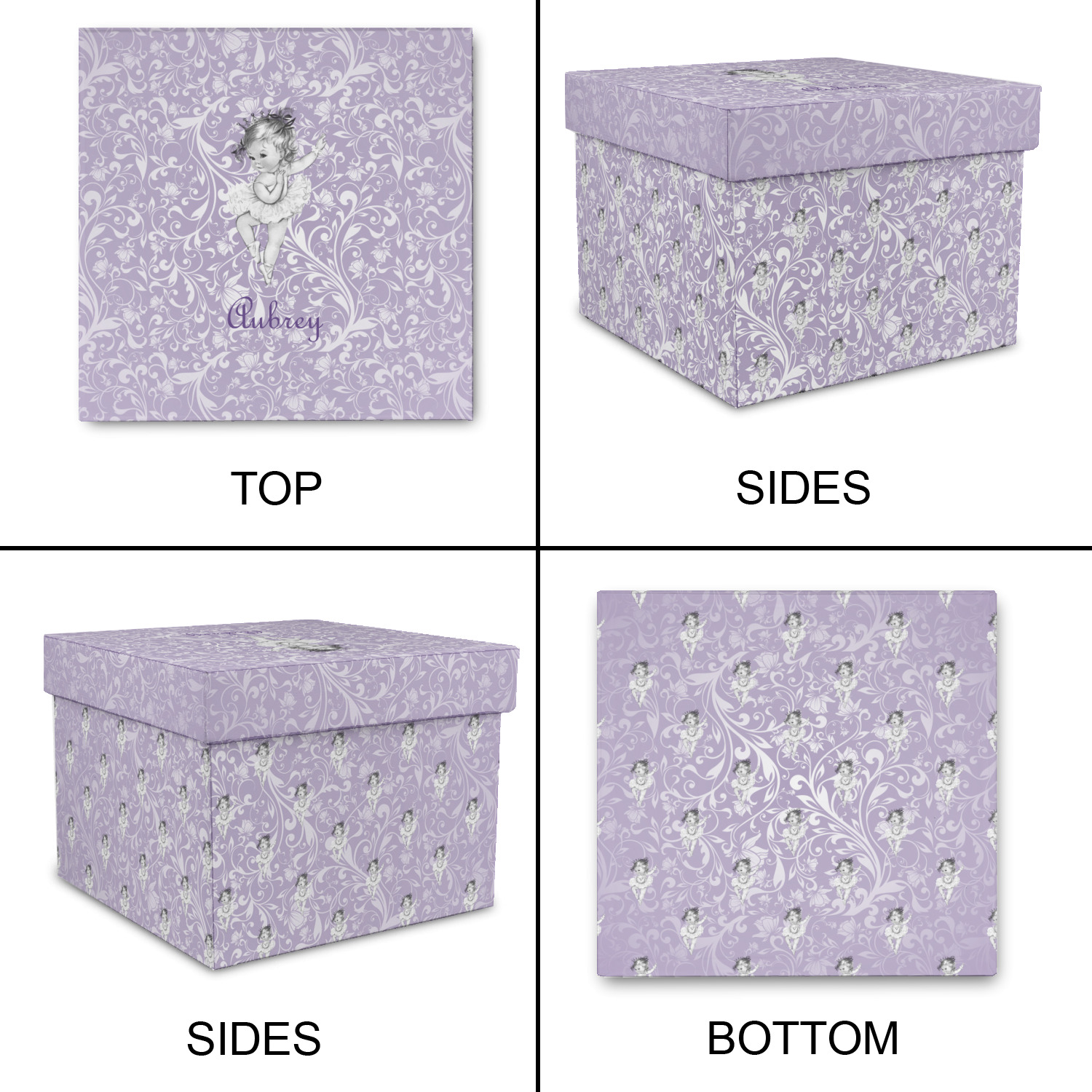 Our ballerina design is simply stunning and is perfect for the baby or little girl that is going to grow up to be a ballerina. We have create yet another layered design. The background is a beautiful, elegant floral pattern that we have done purple/lavender tone on tone color. Our second background is a subtle radial fill to highlight our beautiful ballerina. In the foreground, we have our beautiful vintage ballerina. For personalization, we added her name in a simple upright script font.
