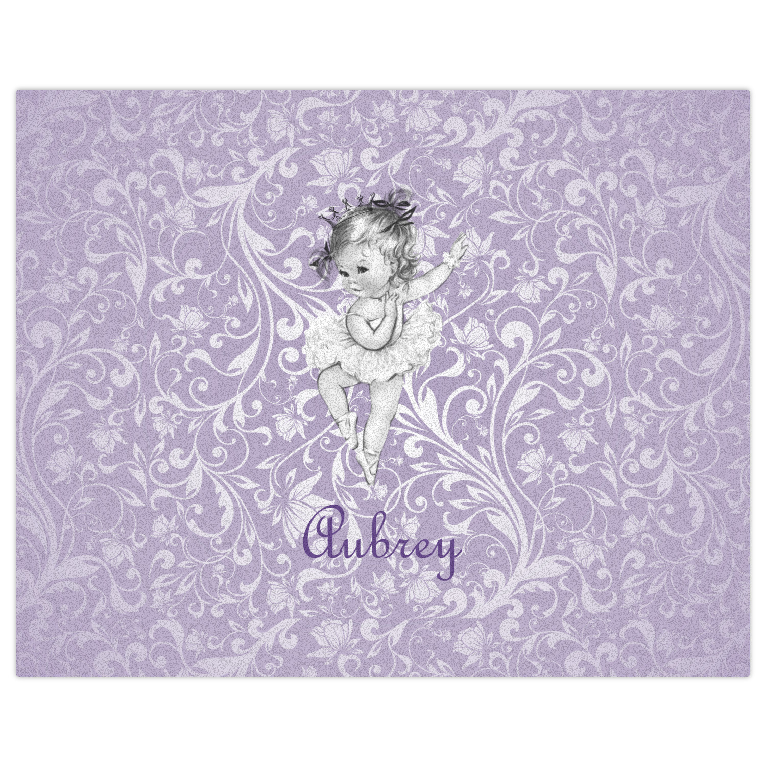 Our ballerina design is simply stunning and is perfect for the baby or little girl that is going to grow up to be a ballerina. We have create yet another layered design. The background is a beautiful, elegant floral pattern that we have done purple/lavender tone on tone color. Our second background is a subtle radial fill to highlight our beautiful ballerina. In the foreground, we have our beautiful vintage ballerina. For personalization, we added her name in a simple upright script font.